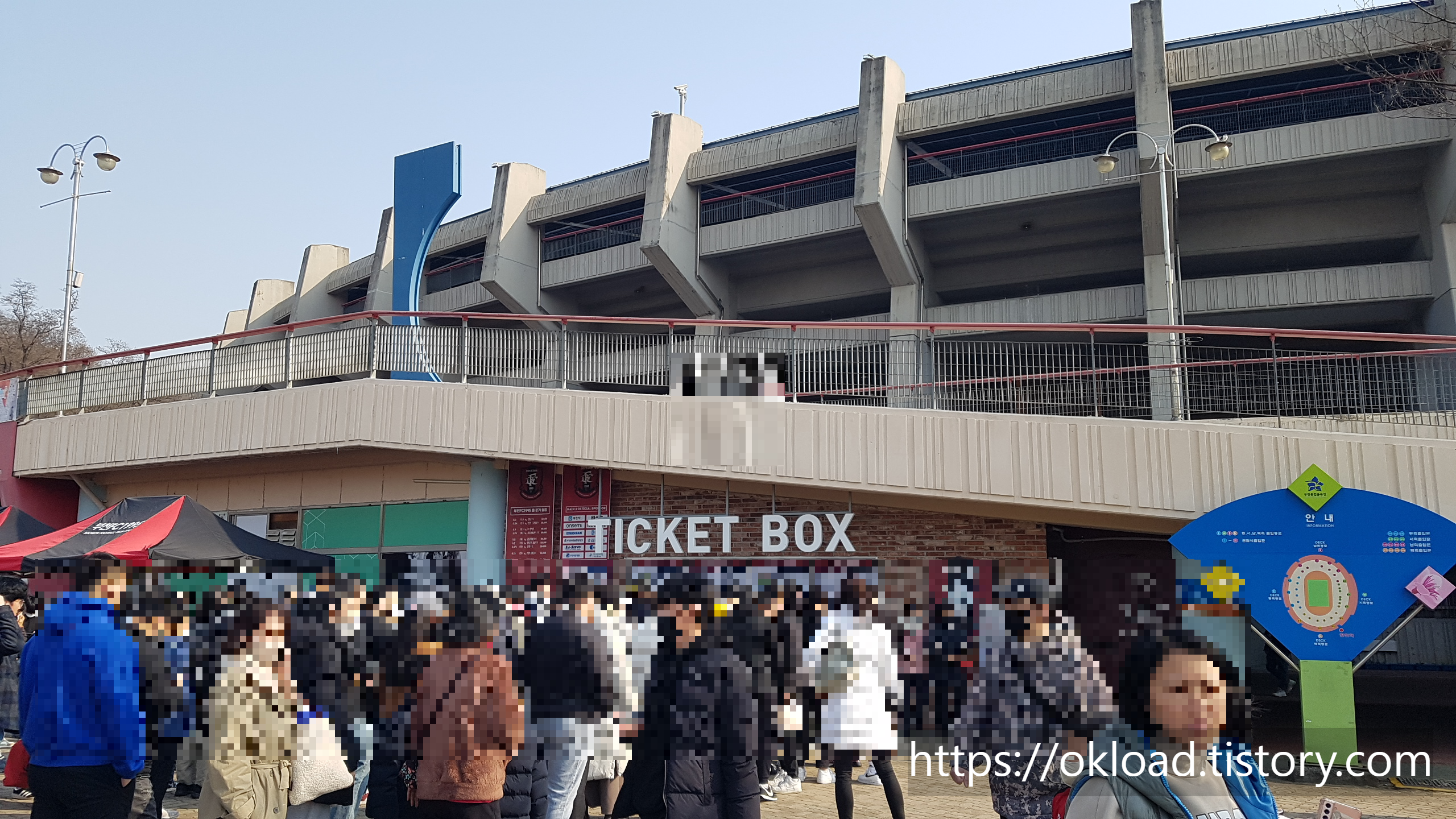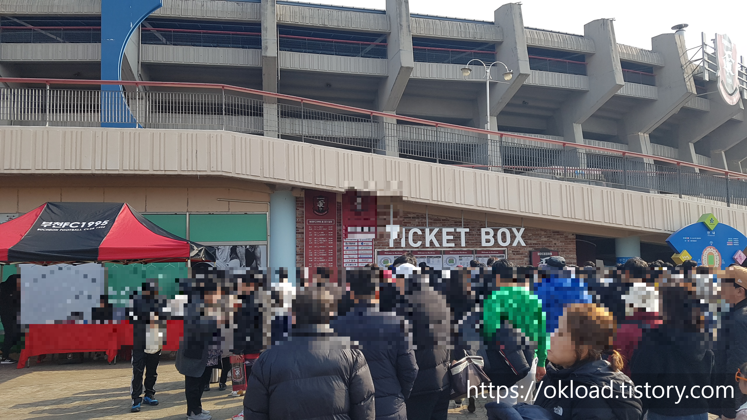 그럼에도 불구하고 이렇게 현장에서 티켓박스 앞에 발권을 위해 줄 서있는 사람들은 인터넷으로 예매하지 않은 관중들이다. 나처럼 2부리그라고 다소 무시하고 현장에서 티켓팅해도 되겠다는 안일한 생각으로 경기장을 찾은 사람들이라고 생각된다. 모바일과 인터넷에 익숙한 젊은 층이 대기줄에 많이 있었던 것으로 보았을 때 현장에서도 수월하게 입장권을 구입할 수 있을 거라고 판단했었던 모양이다.