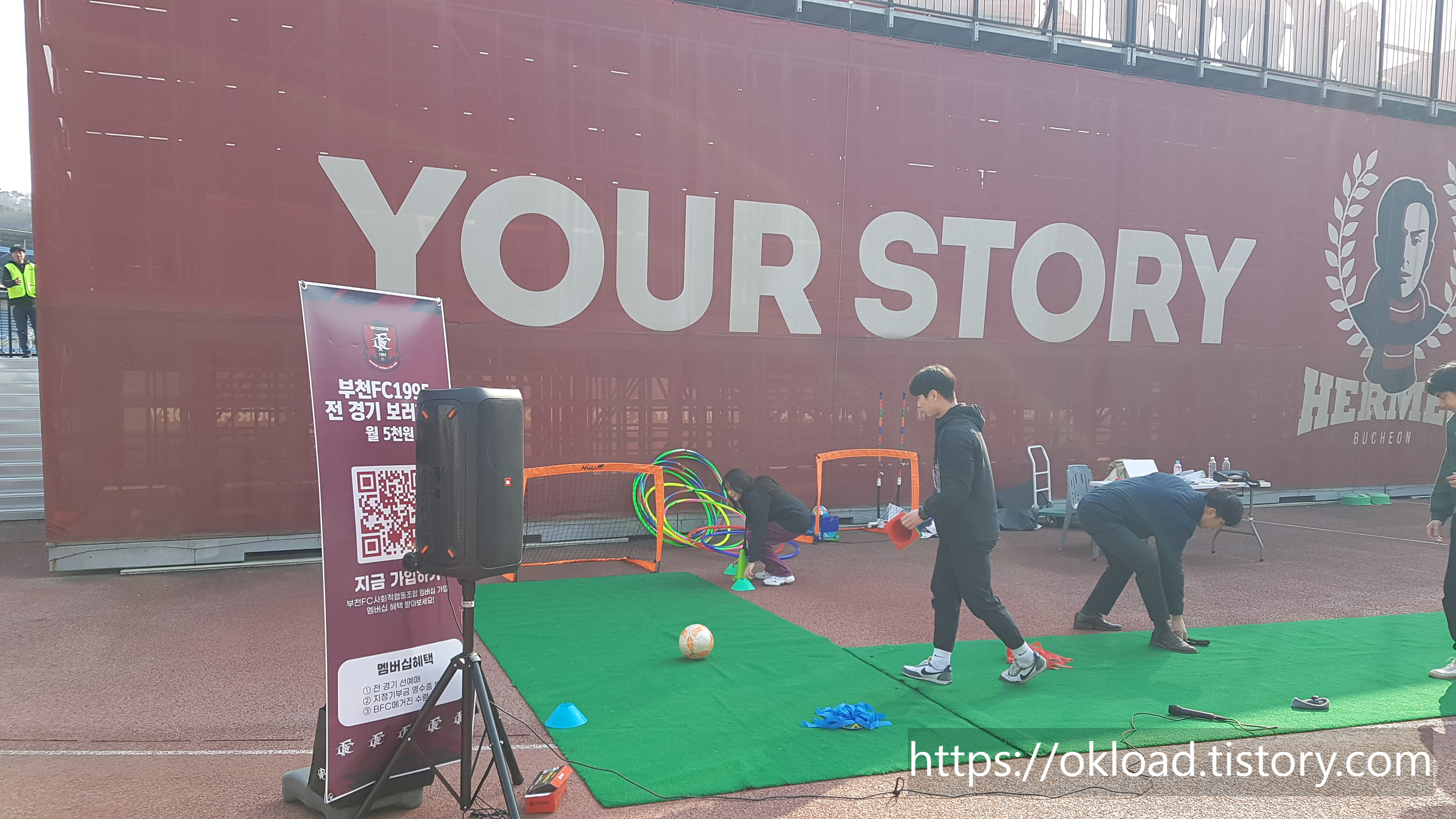 경기장에 들어서자마자 놀이 및 체험 이벤트 부스가 있고, 그 옆에서는 부천FC 대표 선수들이 사인회를 진행하고 있었다. 우리 가족은 모두 패스하고 우리의 좌석으로 직행하였다.