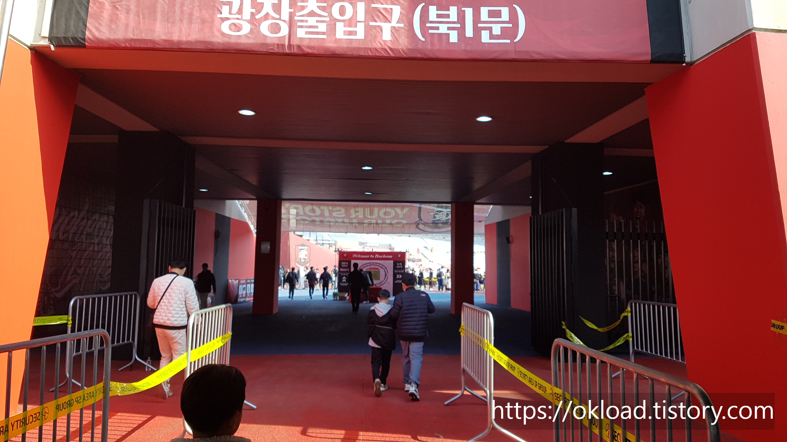 티켓을 확인하고 축구경기장 안으로 들어가는 북문은 매표소에서 가장 가까운 위치에 있다. 티켓확인과 더불어 휴대하고 있는 가방, 백팩, 핸드백 등 소지품을 간단하게 확인받아야 한다. 위험물과 같은 위험하거나 경기에 지장을 줄 우려가 있는 물품을 체크하는 과정인데, 운영직원은 자세히 들여다보지는 않았다. 그냥 쓱 훑어보는 정도로 지나친다.