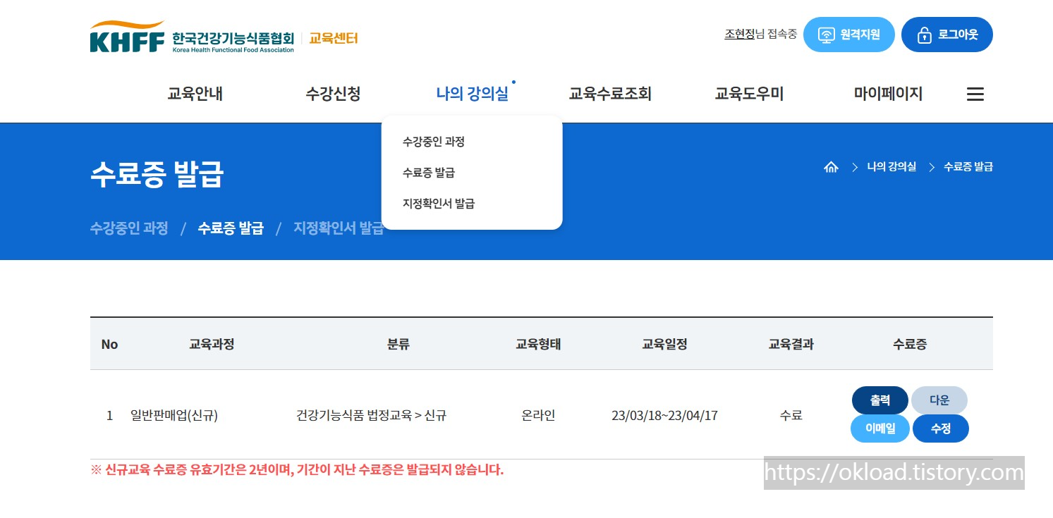 느껴지는 건강기능식품 교육 이수증.