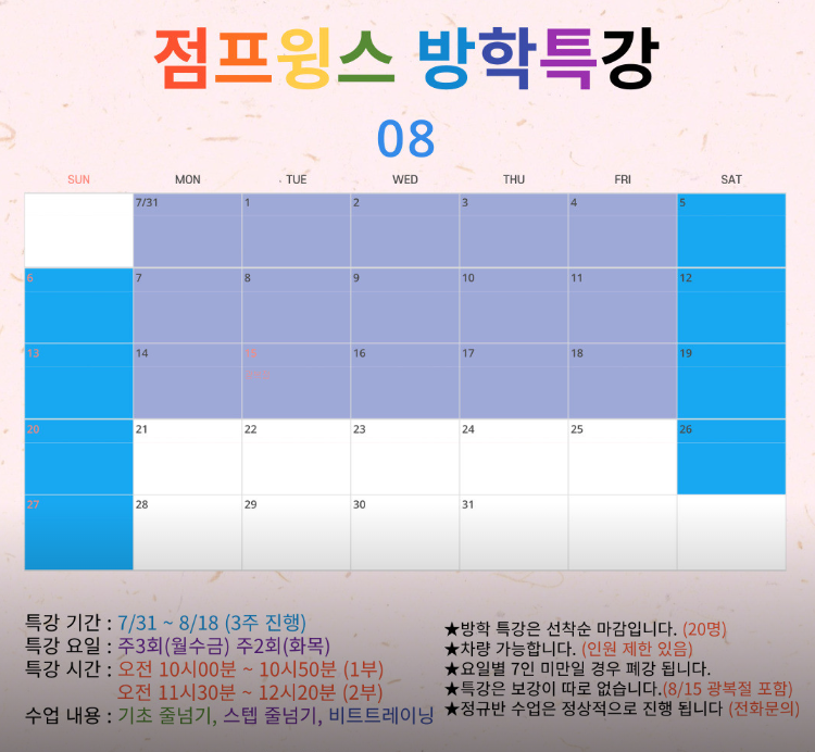 아직까지는 특강을 준비하고 있더라도, 특강일정이 구체적으로 나오지 않은 학원들이 많다. 그래서 한 발 빠르게 특강 신청을 접수하는 점프윙스 줄넘기가 고맙다.