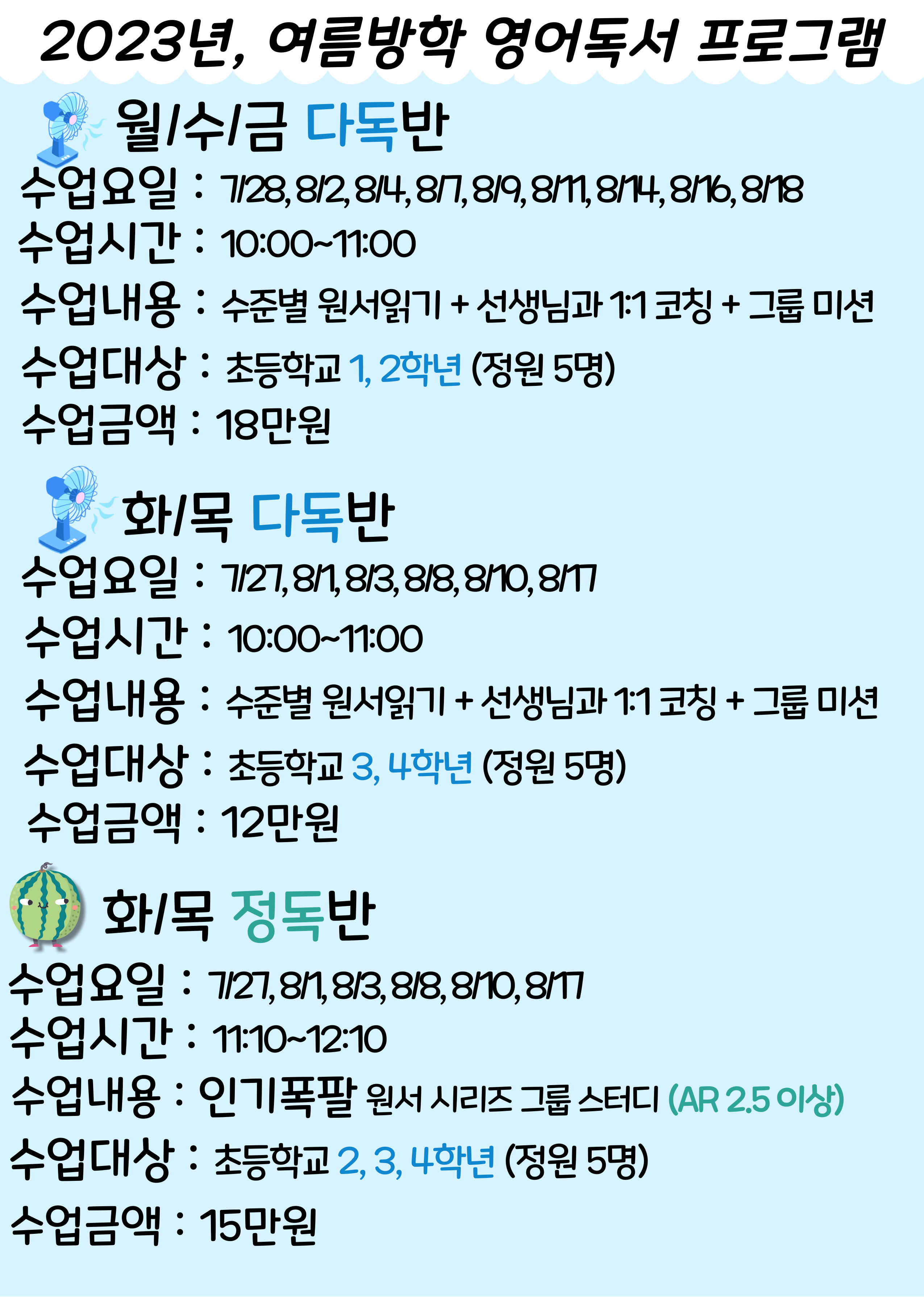 이번 옥길 키즈엔리딩 영어독서공부방 여름방학 방학특강은 월수금 다독반, 화목 다독반, 화목 정독반 총 3학급으로 구성되어 있다. 학급당 정원은 5명으로 선착순 접수하며, 학원비는 12~18만 원으로 책정되어 있다.