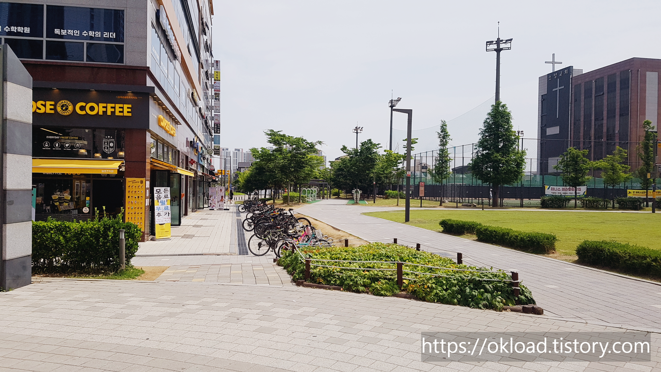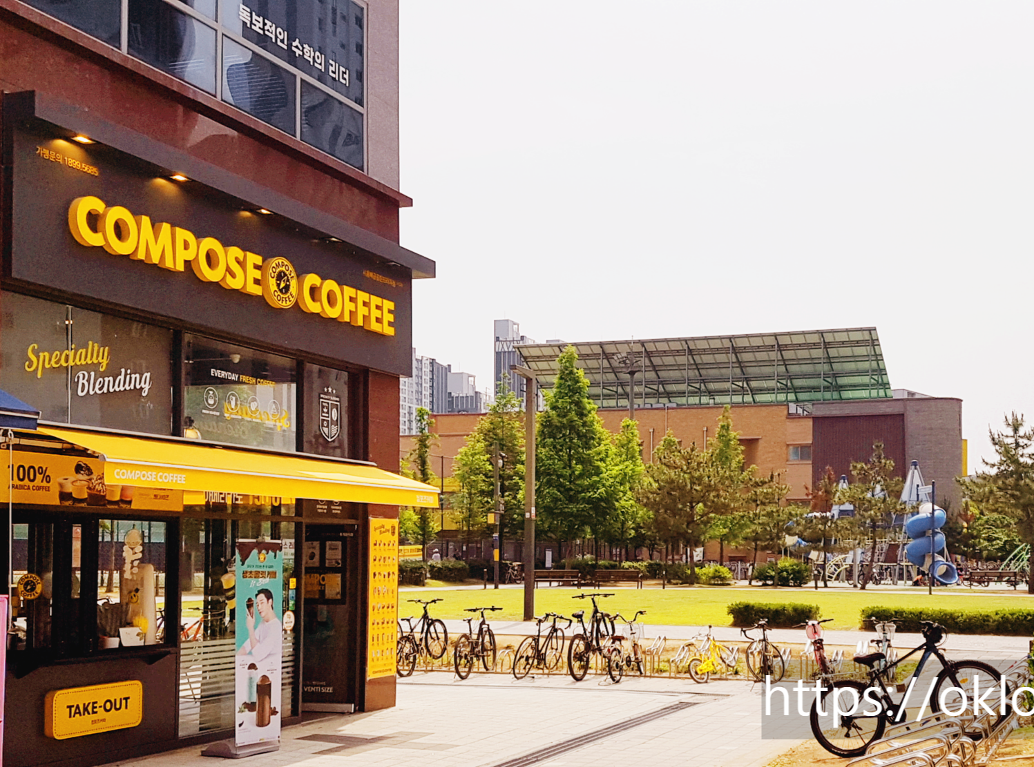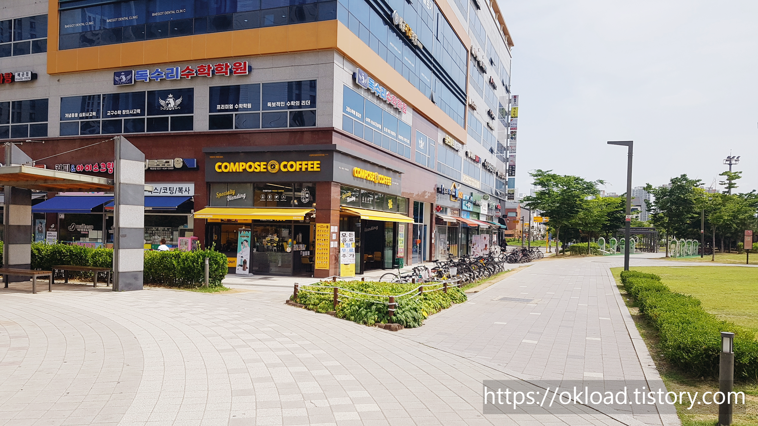 위에서 언급하였듯이 시흥 배곧 한울공원과 배곧SK뷰아파트 앞 공원가 한가운데에 자리 잡은 컴포즈커피는 손님의 입장에서 보았을 때 매우 눈길이 가는 위치다.