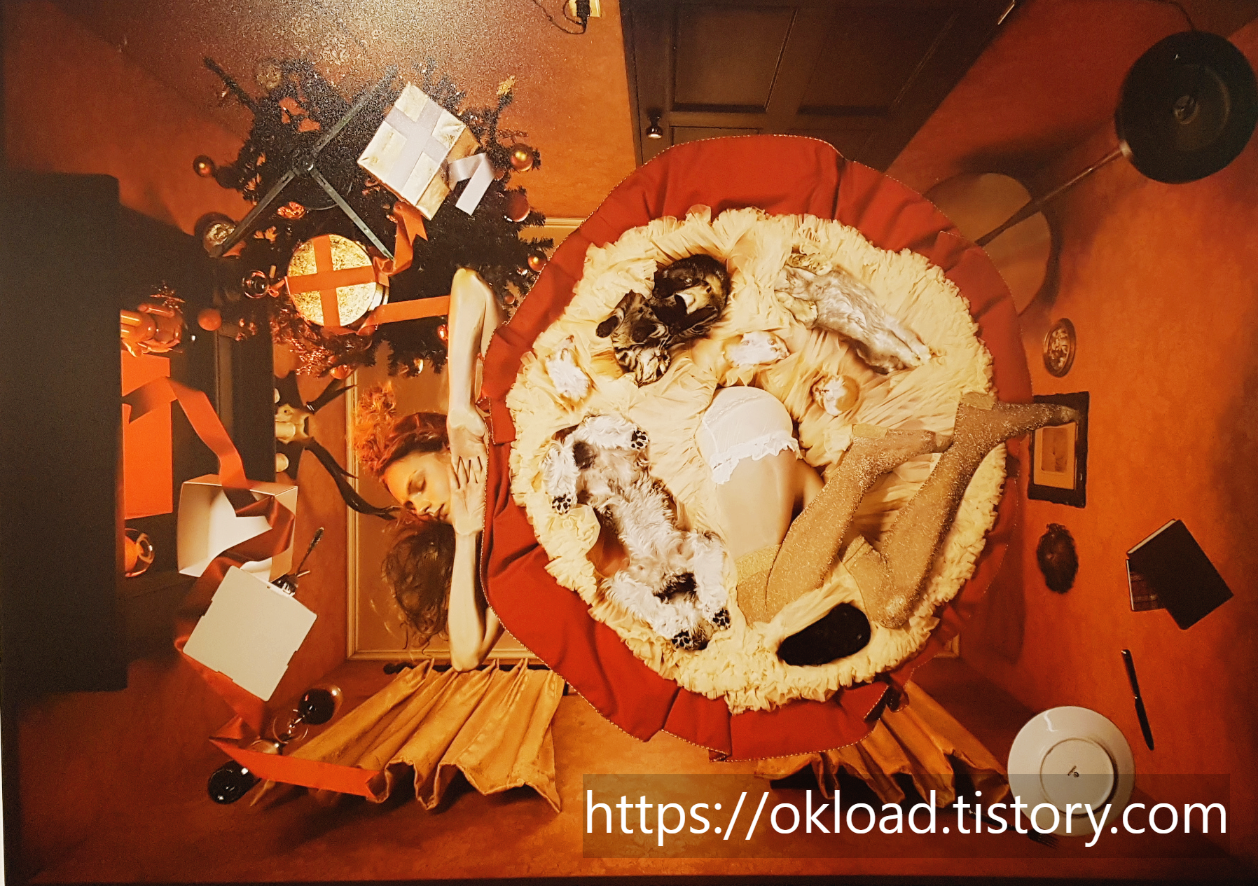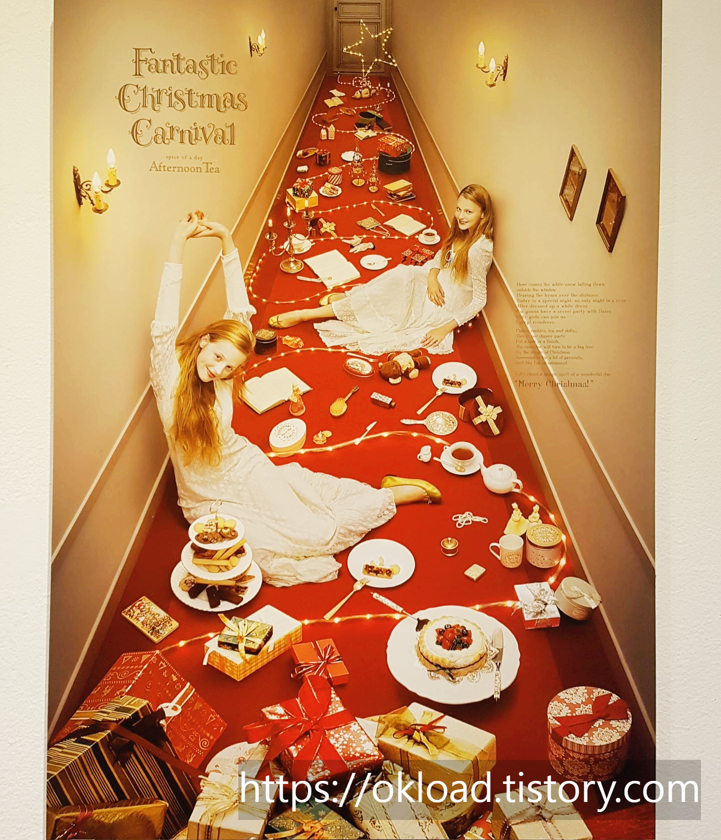 계단과 복도의 안쪽이 좁아지는 원근감을 이용해서 크리스마스 트리를 탄생시켰다. 실제 복도의 벽을 그대로 사용하면서 촬영해야 했기 때문에 계단처럼 보이는 지그재그 모양의 판자를 복도 위에 올려놓고, 모델들은 그에 어울리게 중력을 받는 것처럼 비스듬히 기울여서 앉은 상태로 포즈를 취하고 있다. 멀리서 보면, 크리스마스트리 중간에 요정 2명이 앉아있는 모습 같다.