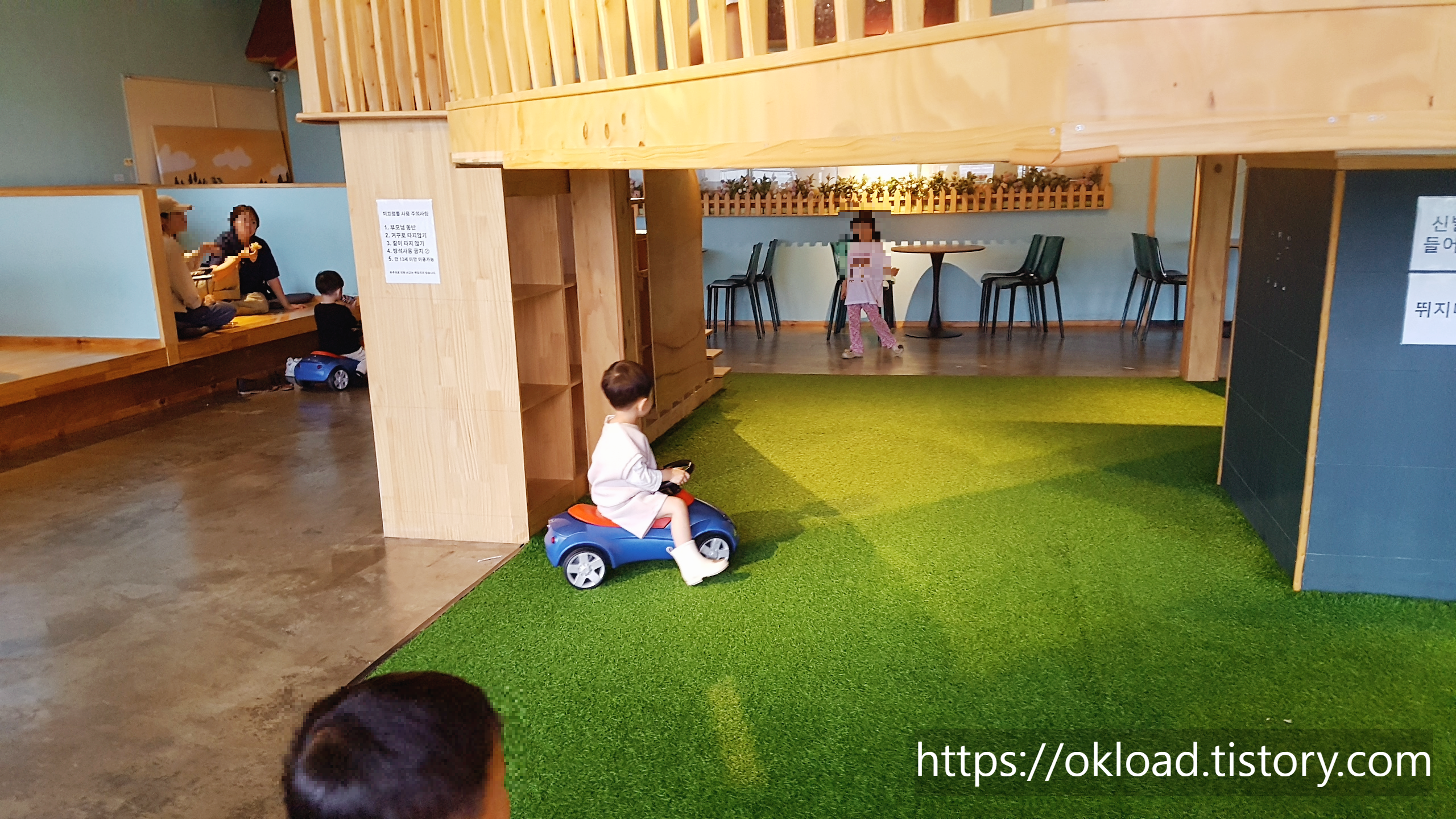 우리 가족이 아마츄어작업실 카페를 즐겨 찾는 가장 큰 이유는 2층의 키즈존 때문이다. 아이들이 BMW 붕붕카는 한 대씩 몰고 다니고, 중앙에는 2층 놀이공간과 미끄럼틀이 자리 잡고 있다.