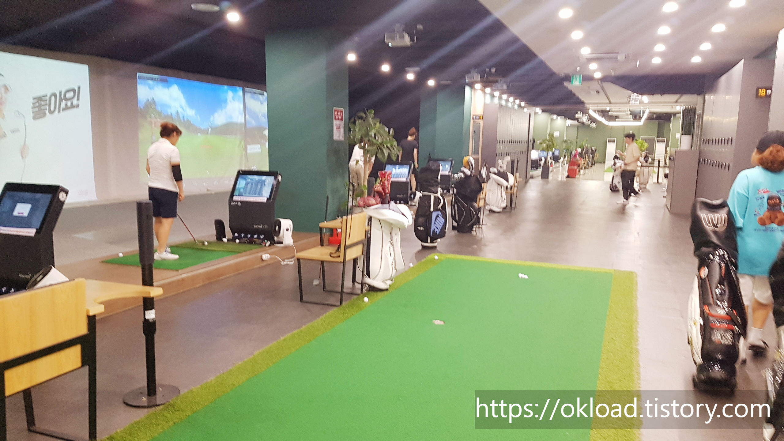 대형 스크린골프 타석 못지않게 연습하는 아카데미 공간 역시 매우 넓고 넉넉하게 마련되어 있다. 주중에 방문하였음에도 연습 레슨 타석은 모두 꽉 차 있었다. 아무래도 평일 낮이다 보니 여성회원들이 많이 보였다. 평일에 여유로이 골프를 즐기고 있는 회원들이 부러워 보였다.