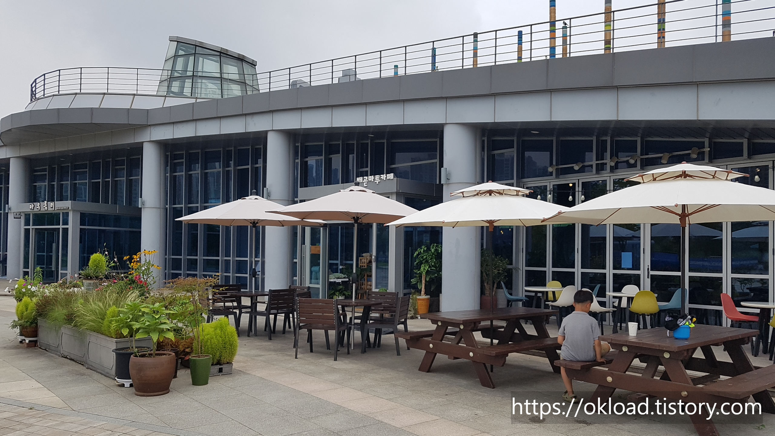 햇살이 약해지기도 전에 예정보다 일찍 공원에 도착하면, 잠시나마 더위를 피할 공간이 필요한데 이때 찾는 곳이 배곧 생명공원 안에 마련된 카페배곧마루다. 마치 소나기를 피해 처마 밑으로 가듯이.