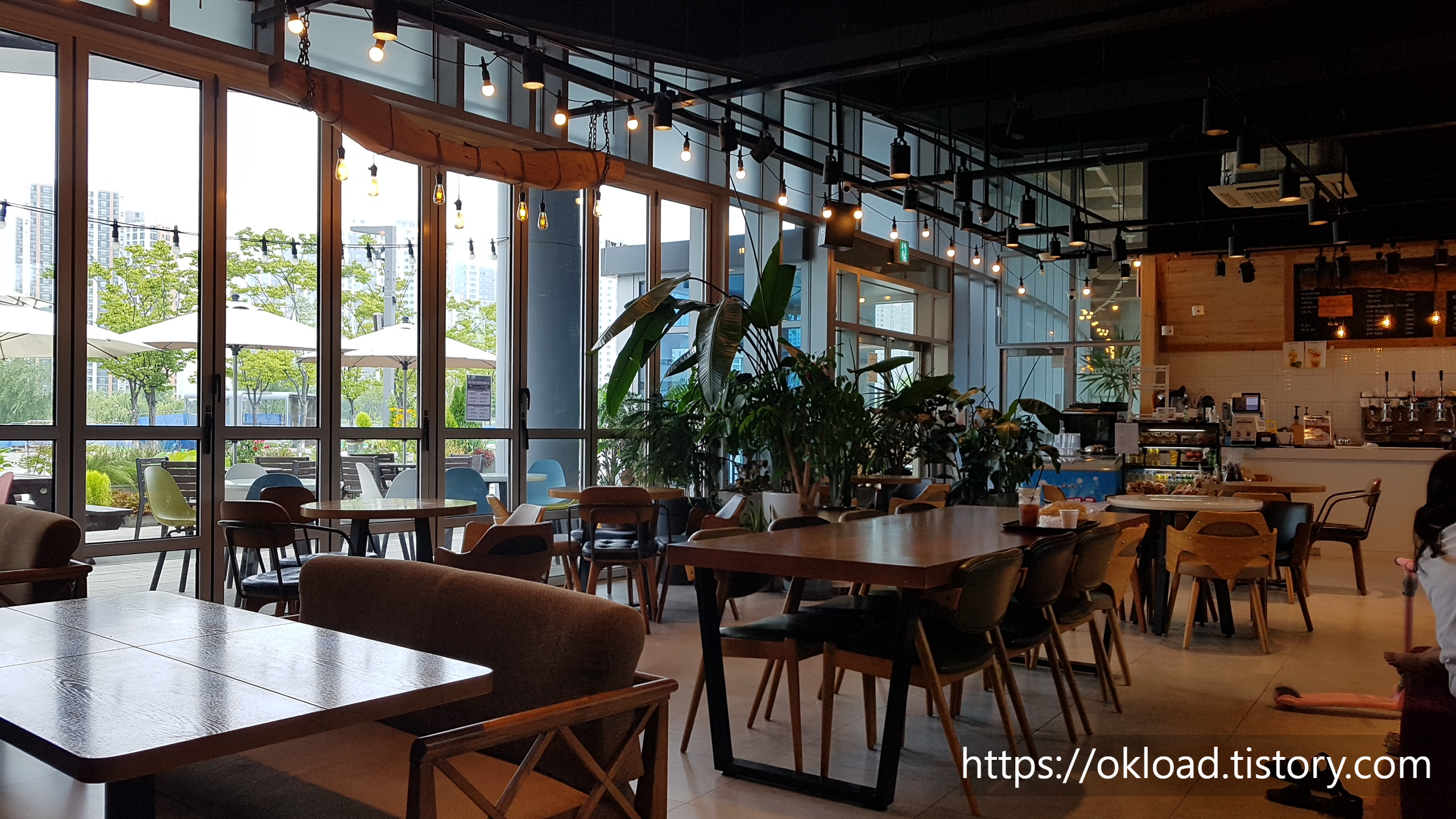 배곧생명공원카페 배곧마루카페의 내부 모습은 이러하다. 공원에서 운영하는 카페치고는 넓은 공간에 넉넉한 좌석들이 마련되어 있다. 넓은 창을 통해서 공원뷰를 바라보면서 음료를 마실 수 있다.