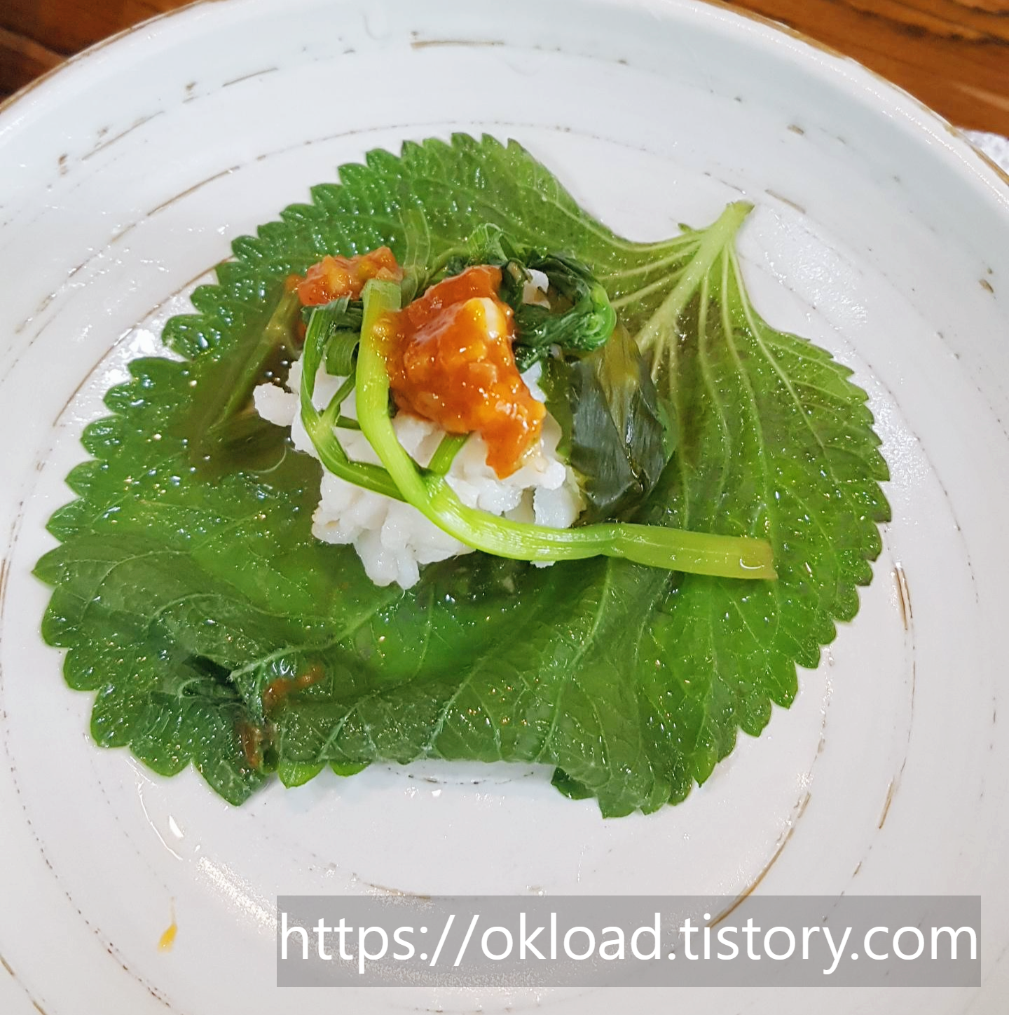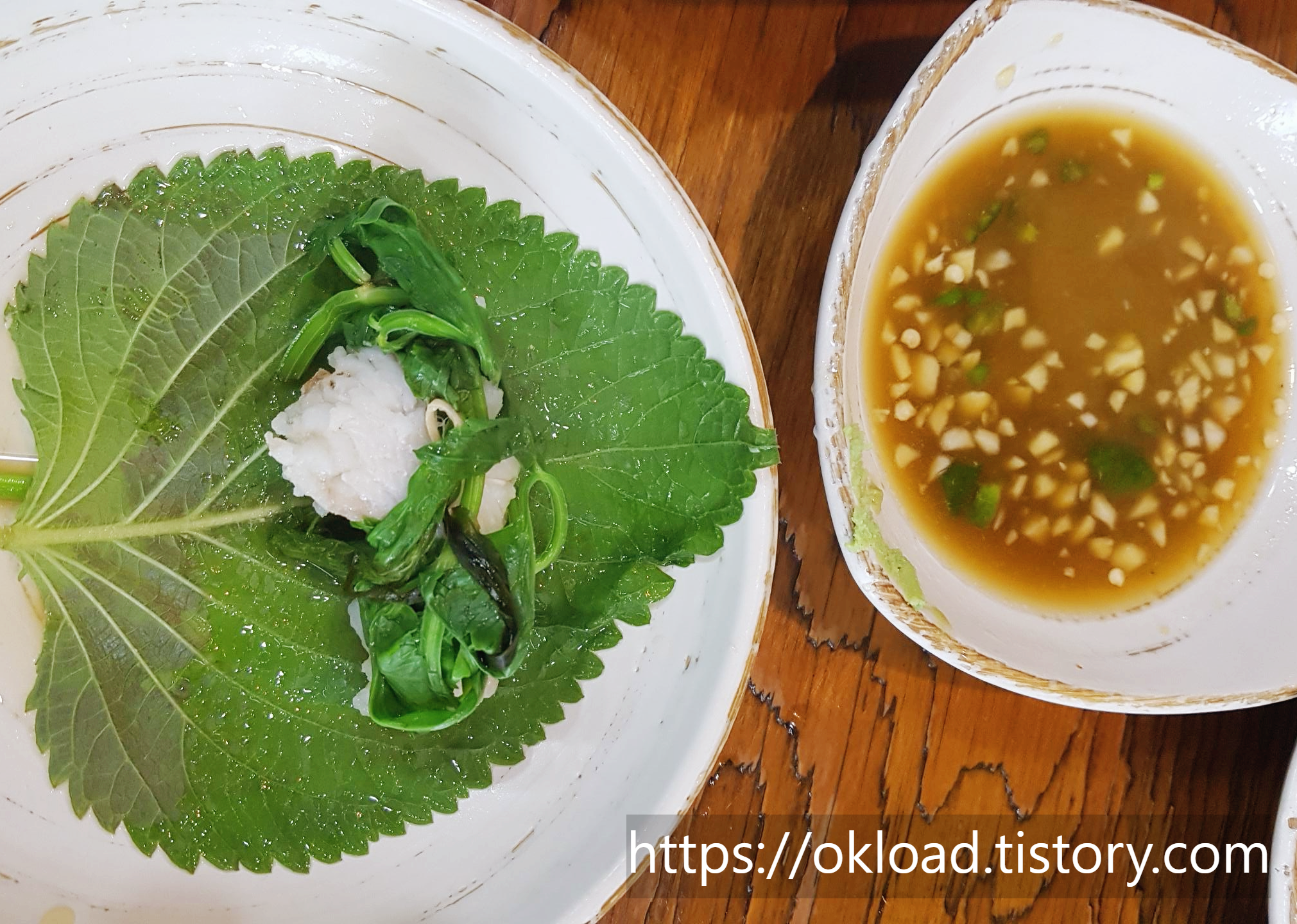 장어샤브샤브 육수에 살짝 데친 깻잎을 바닥에 펼쳐놓고, 그 위에 소스를 찍은 갯장어(하모)와 야채류를 올려서 싸 먹는다.