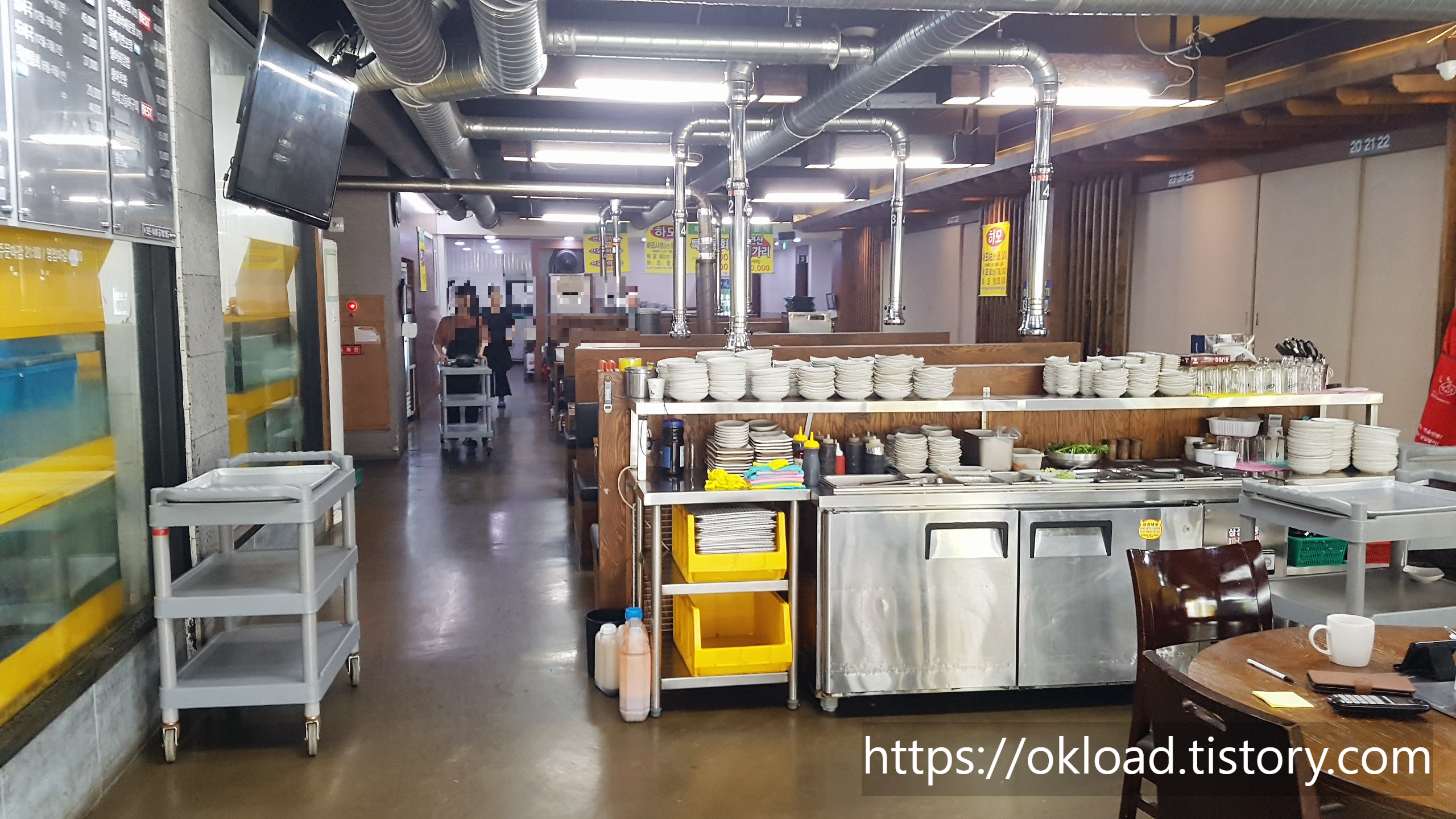 사진에 모든 좌석을 담지는 못하였지만, 출입구 쪽은 소수 그룹의 일행들이 식사하기 적합해 보이고, 안쪽으로 들어가면 단체 연회가 가능한 좌석들도 마련되어 있어서 회식 장소로도 좋아 보인다.
