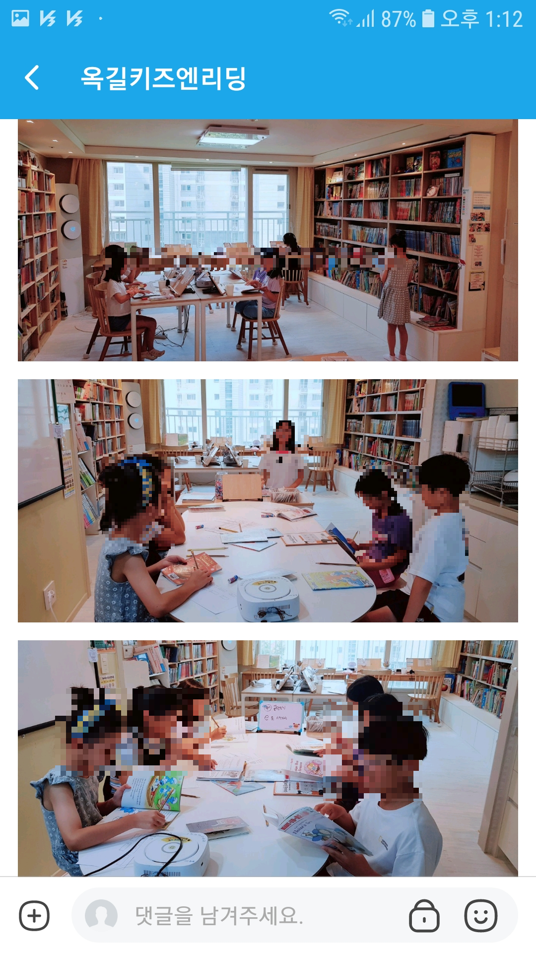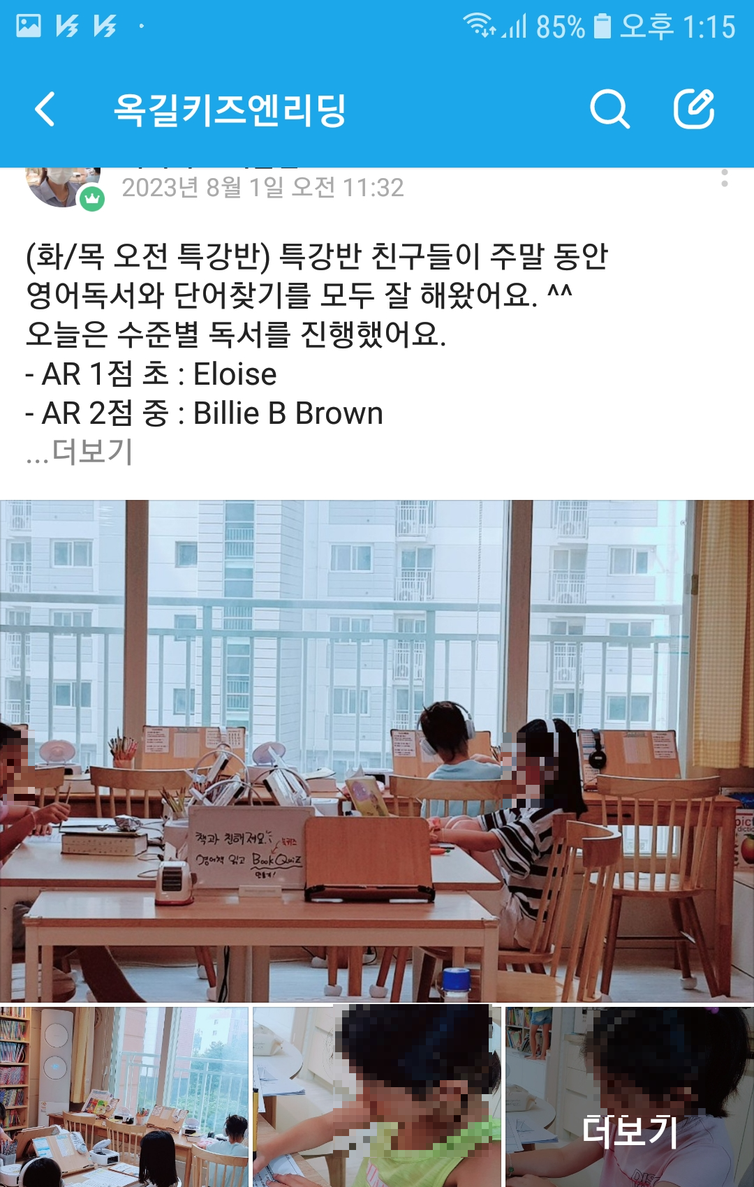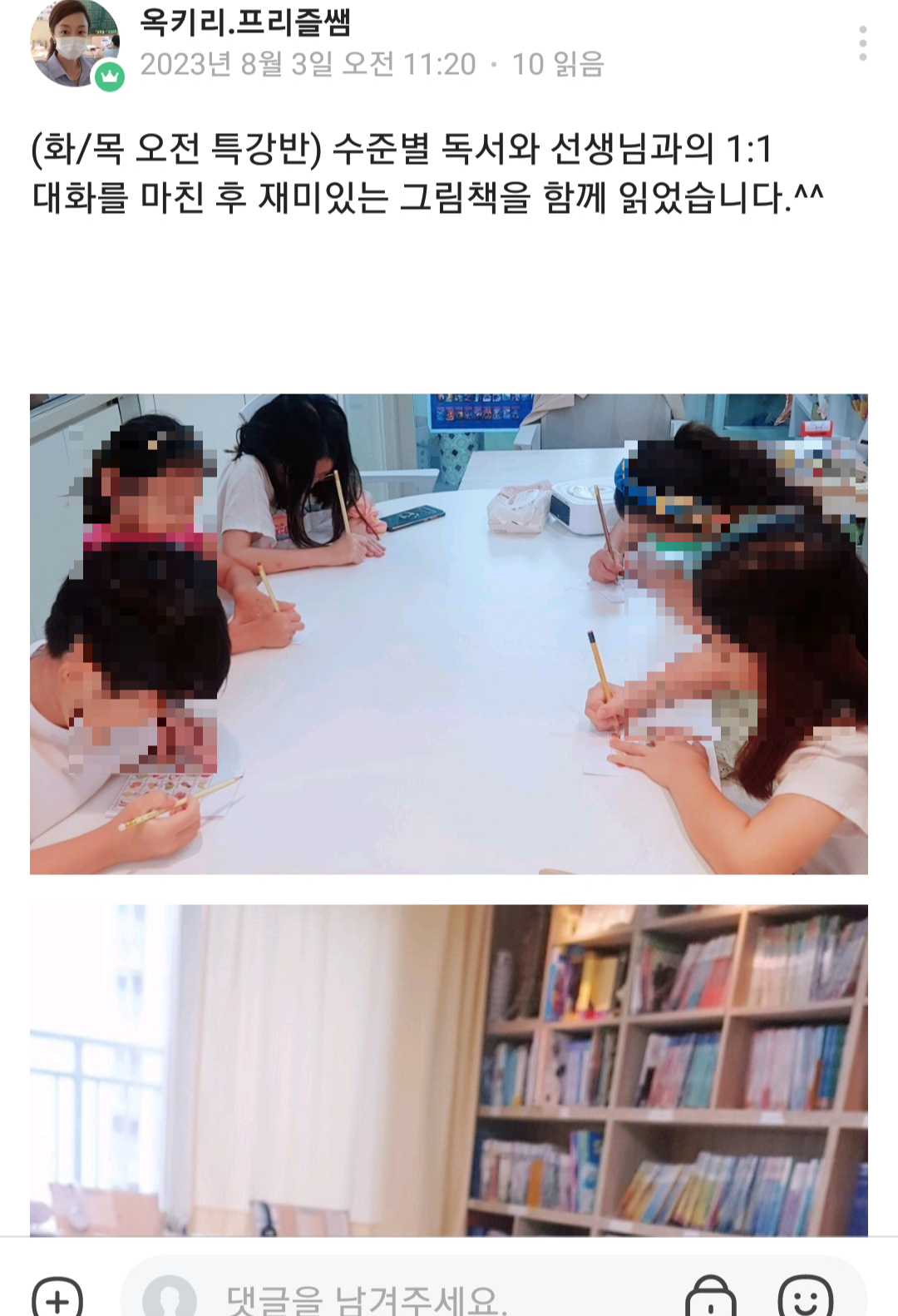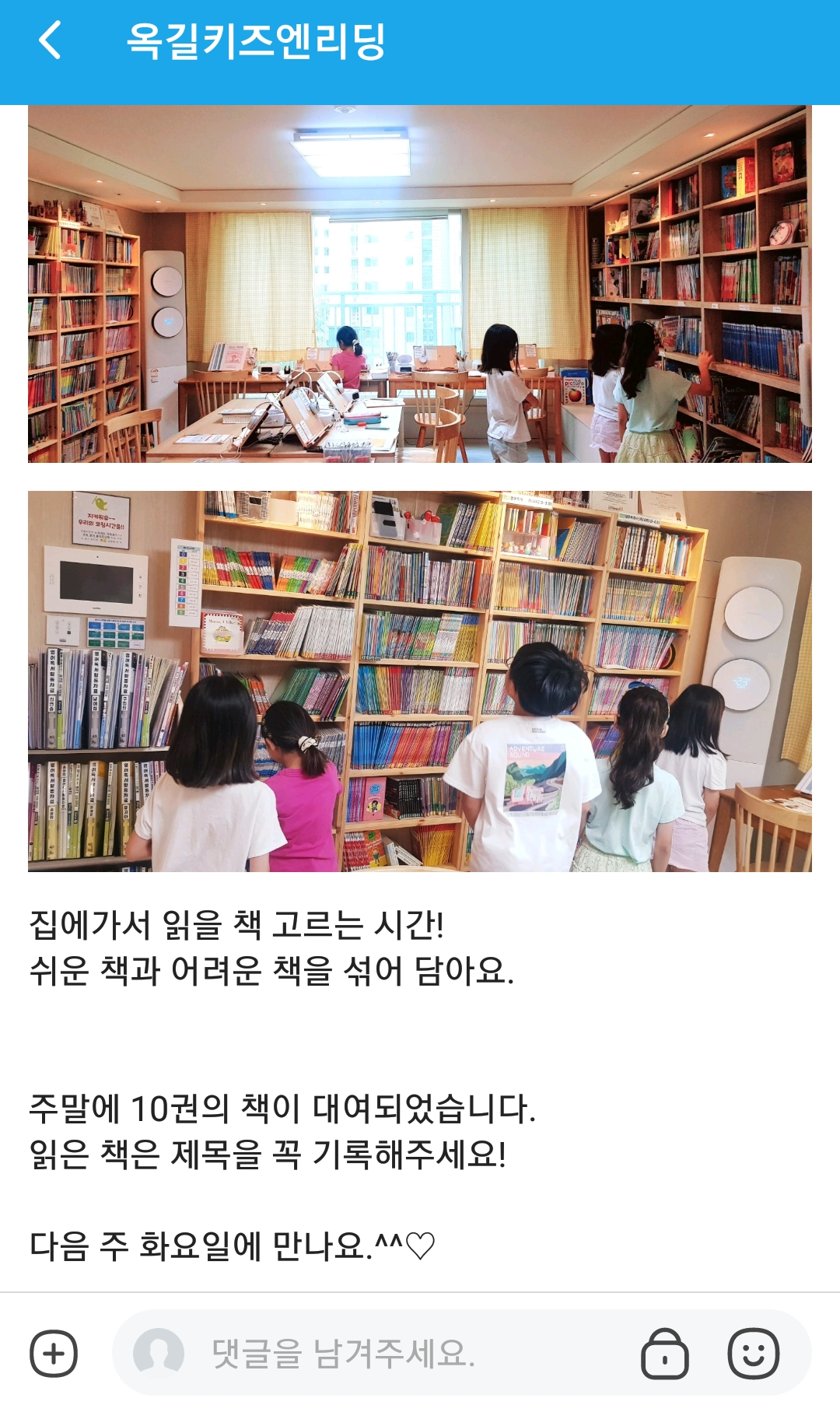 키즈앤리딩 원장님의 똑 부러지는 영어교육 철학과 이를 바탕으로 학부모와 적극적으로 소통하며 피드백을 주는 모습이 인상 깊었다. 이미 키즈앤리딩 블로그와 인스타에 게시된 엄마표영어와 자녀영어교육 관련 자료들를 통해서 봤었는데, 이번 체험수업에서는 수업 당일마다 해당 클래스 밴드방을 통해서 그날의 수업내용과 학부모가 챙겨야 할 사항들을 사진과 함께 게시해 주었다.