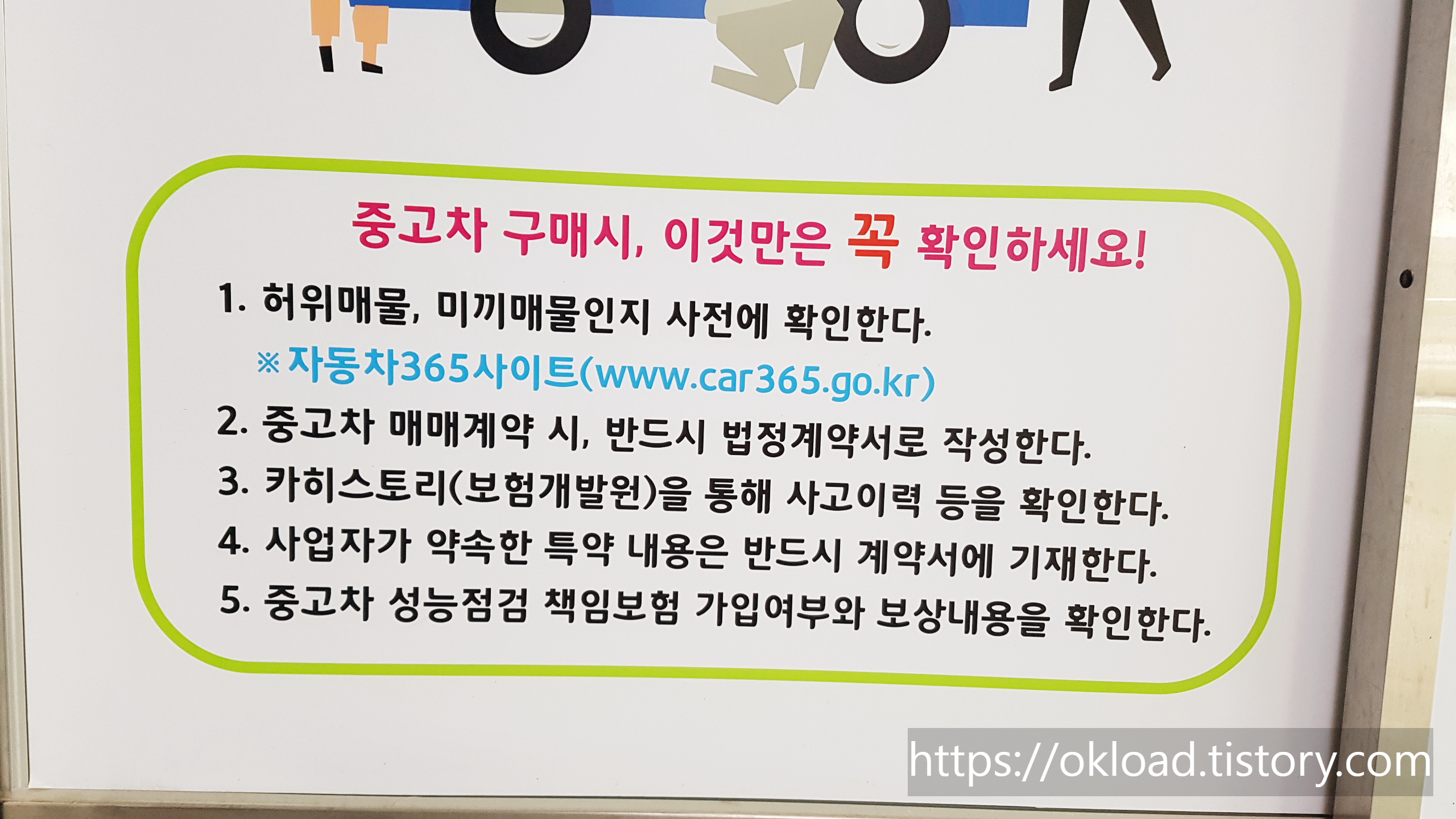 부천 차량등록사업소 주변에는 차량거래, 등록, 폐차 등과 관련된 유용한 정보들이 주변에 게시가 되어있다. 그중 중고차 구매 시 기억해 두면 유용한 정보가 눈에 들어왔다.