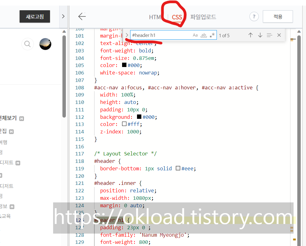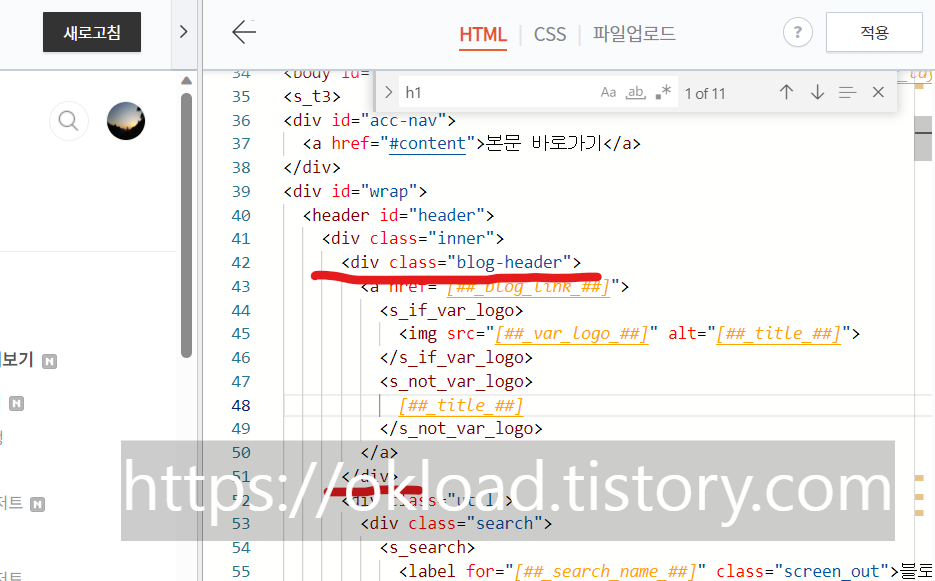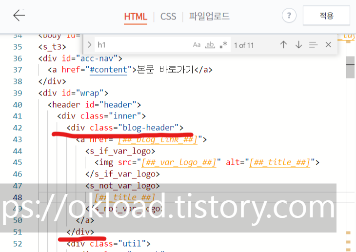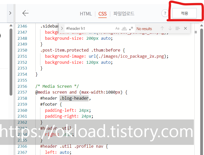 찾아낸 "#header h1"에서 "h1"부분만 ".blog-header"로 변경한다. 정리하면 검색된 5개(북클럽 스킨 기준) 모두를 "header .blog-header"로 수정한 후 우측상단 "적용"을 꼭 눌러주면 모든 H1 태그 기본설정이 완료된다.