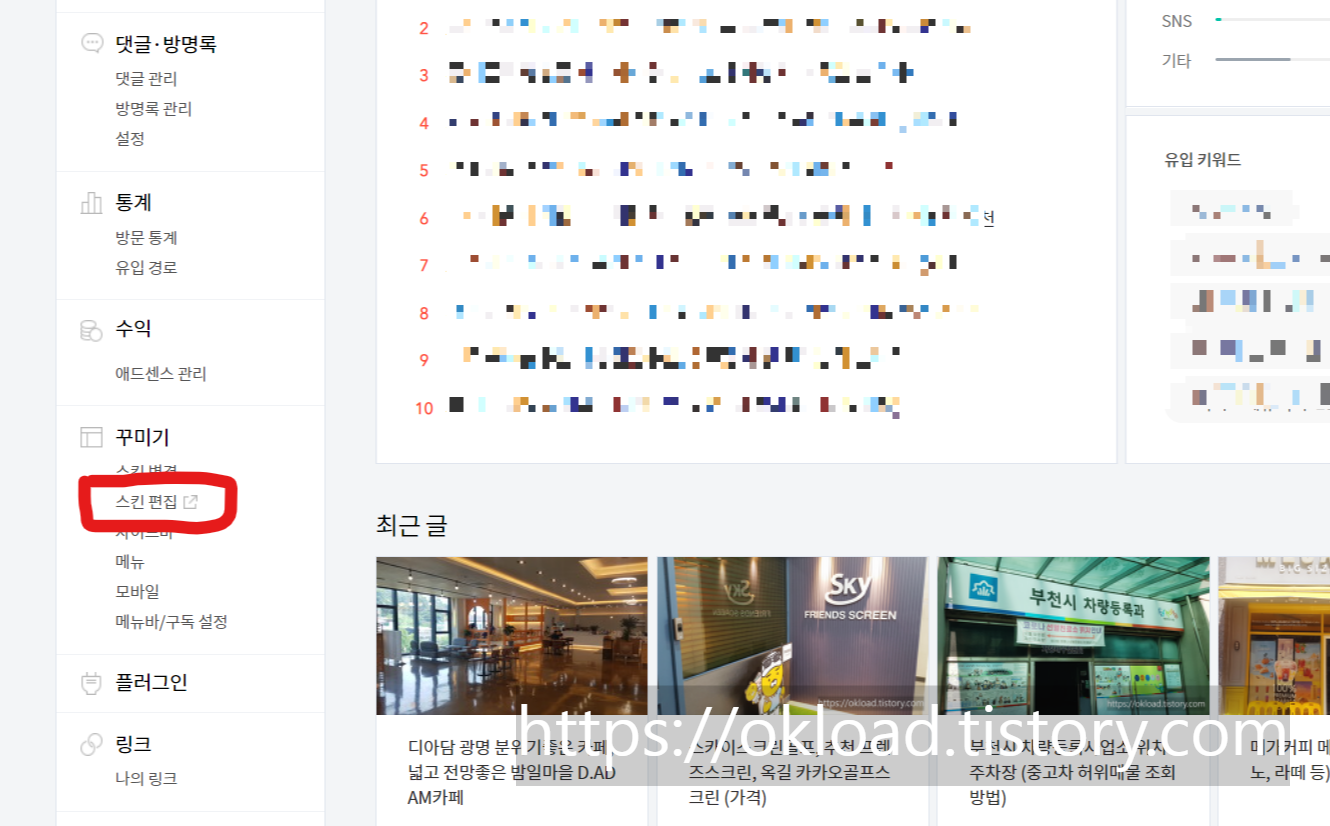 티스토리 스킨편집 항목을 클릭하여 들어간다.