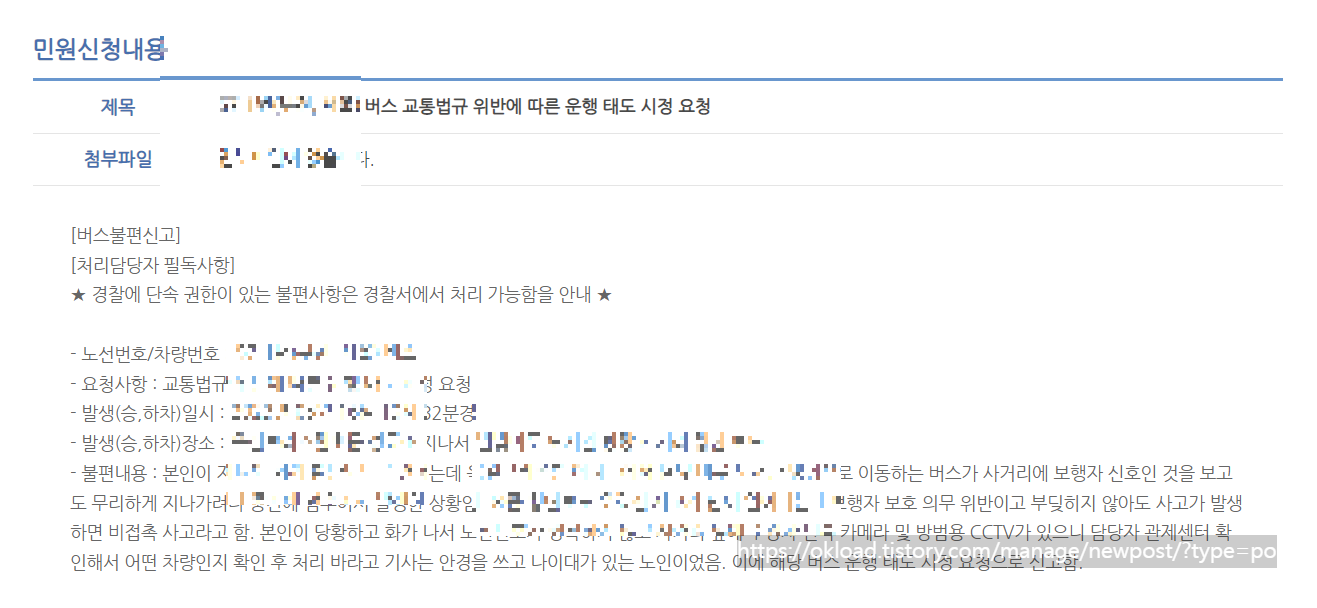 민원신청내용을 클릭하니, 버스 교통법규 위반에 따른 운행 태도 시정 요청이라는 제목으로 민원이 정상적으로 접수되어 있음을 확인했다.
