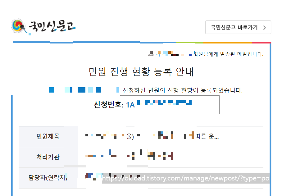 민원진행 현황 등록을 클릭하면, 국민신문고 신청번호와 처리기관, 담당공무원 담당자의 이름과 연락처도 확인할 수 있다.