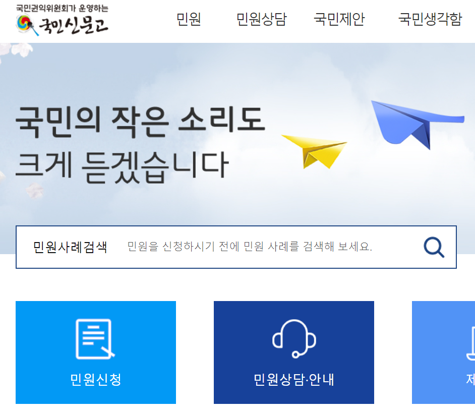 국민신문고 홈페이지 메인 화면의 모습이다. 여기서 신분 인증절차를 마치고 상단의 '민원'을 클릭하여 사이트에서 안내해주는대로 그대로 따라가면서 신고하려는 민원내용을 작성하여 신청하면 된다.