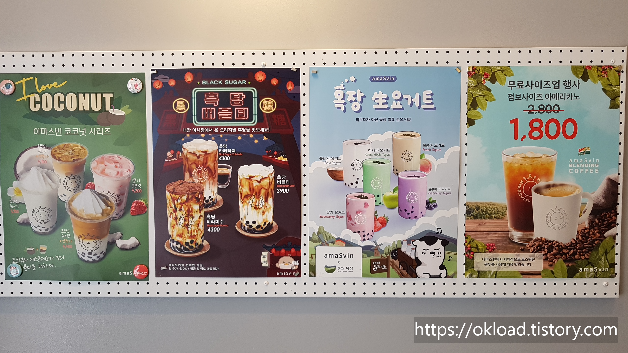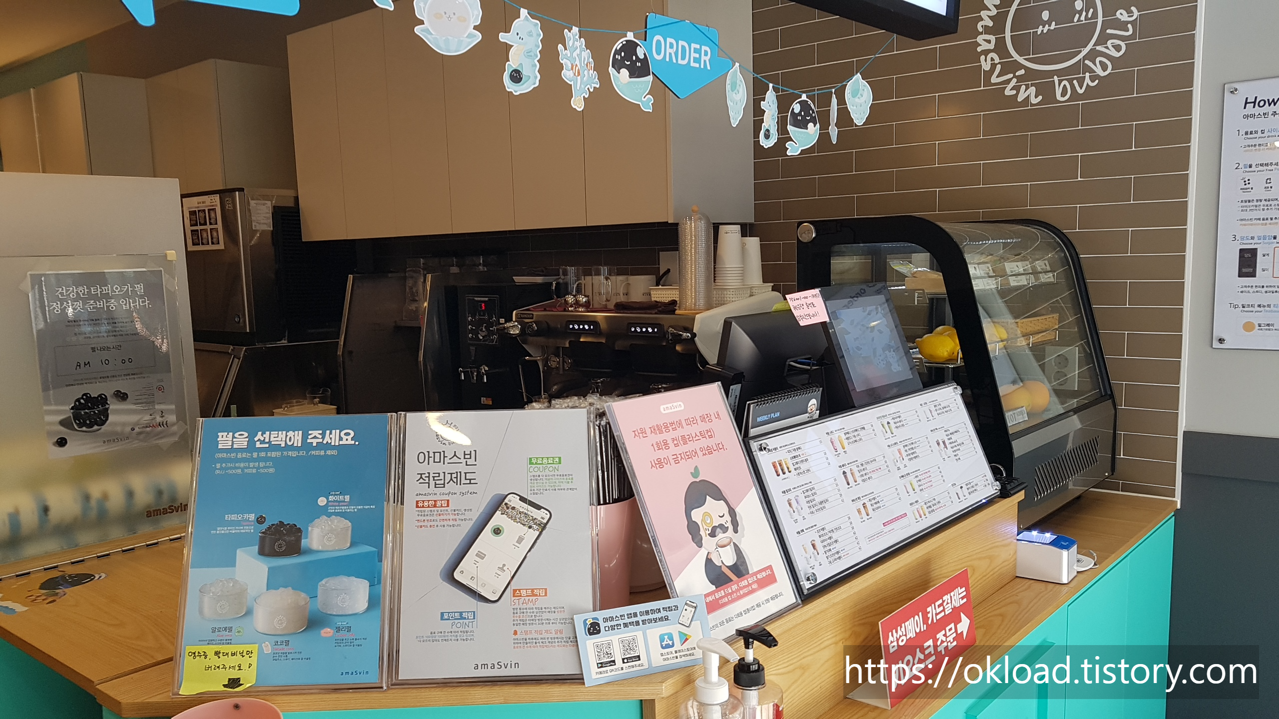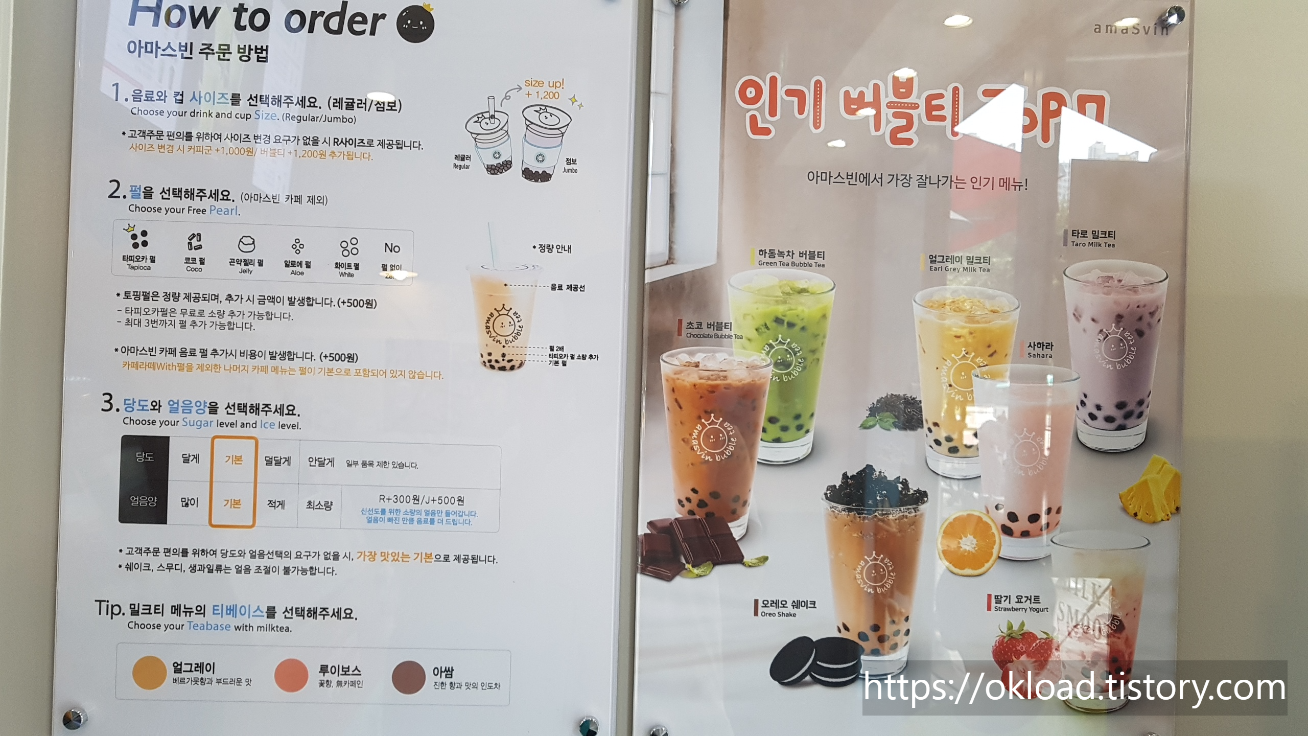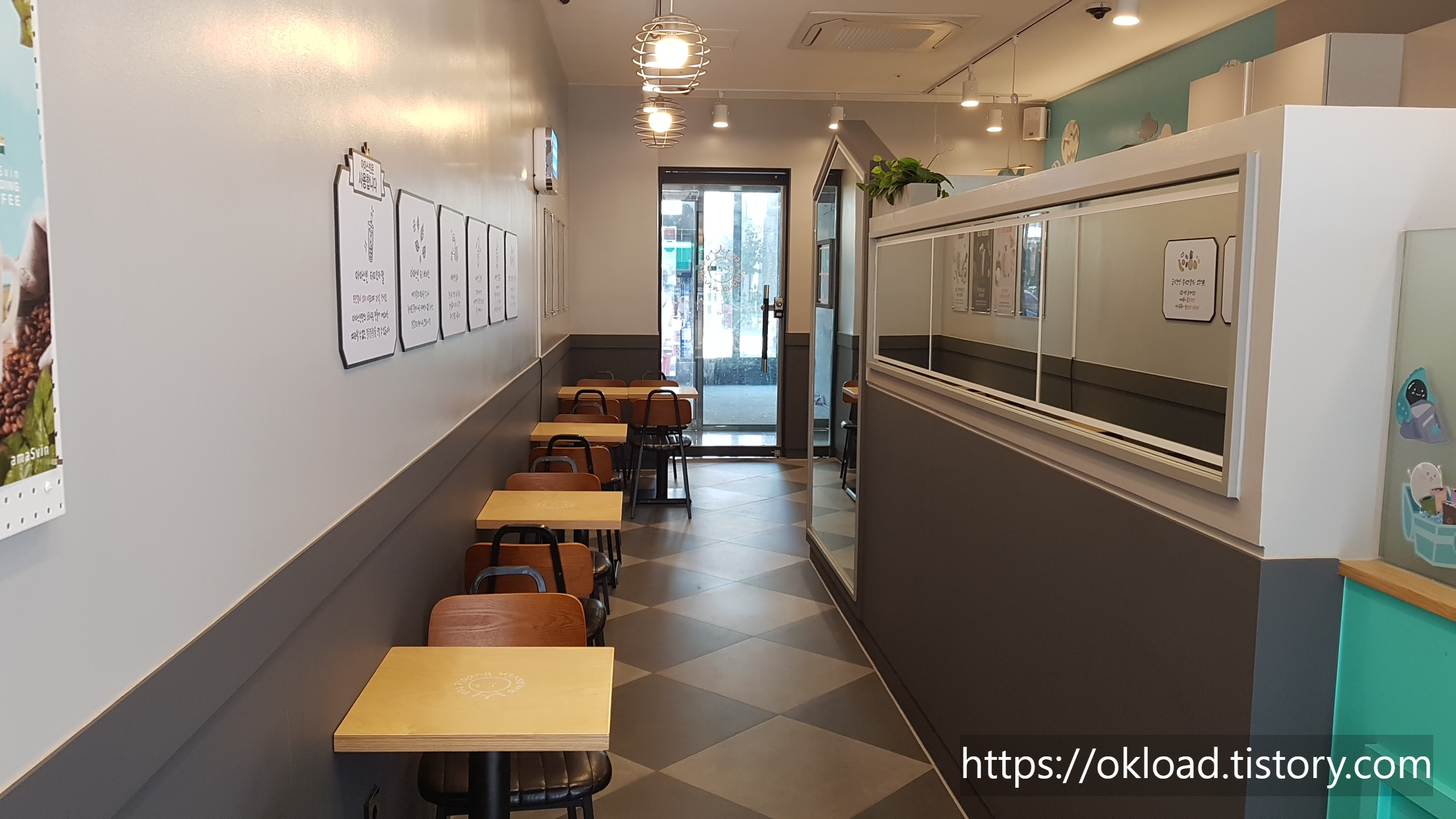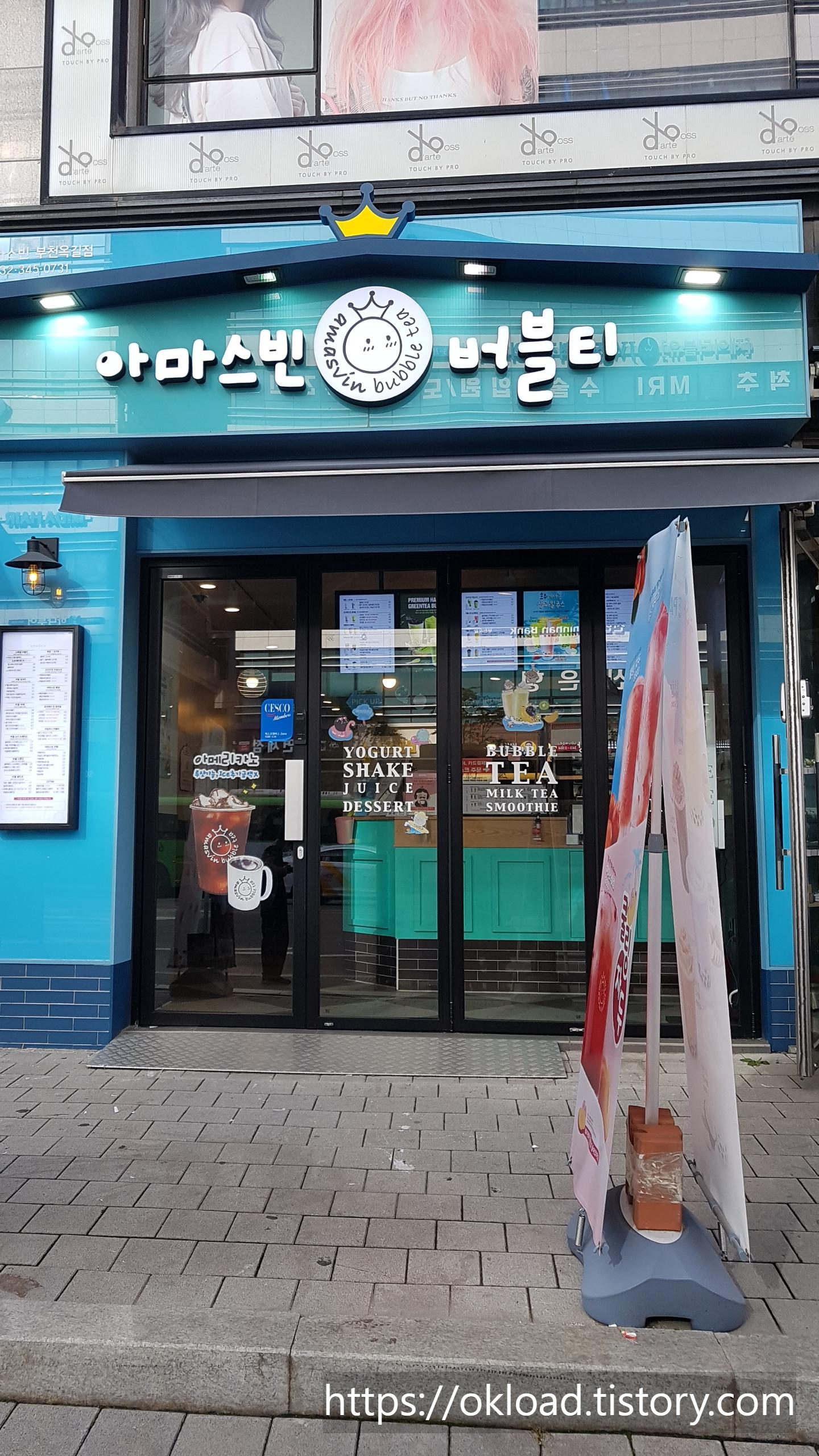 옥길지구 옥길동 카페 중에서 내 입맛에 가장 맞는 버블티 맛집 아마스빈 버블티다. 이전에 아마스빈버블티 카페를 포스팅했었는데, 당시 가게 안 테이블에 손님들이 많아서 내부사진을 촬영하지 못했었다. 그래서 이번 휴가기간 중 평일 낮 손님이 가장 없는 시간대에 방문해서 실내를 사진 찍었다.