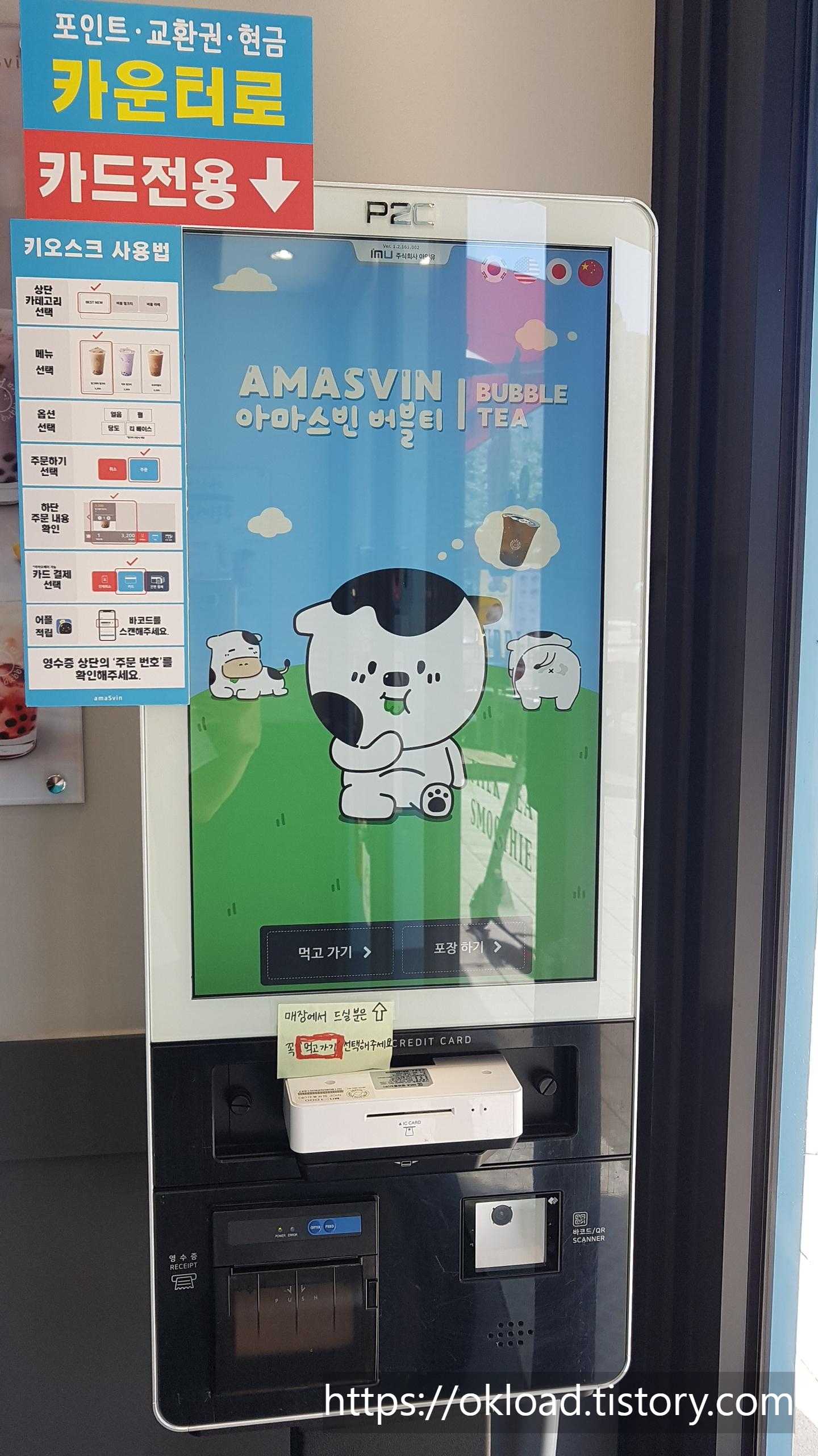 아마스빈은 현금을 제외하고는 키오스크(무인결제)로 주문을 해야한다. 가게 안에 들어서면 아마스빈버블티 주요 매뉴의 사진과 아마스빈 키오스크 주문방법이 보인다. 키오스크 무인결재 방법은 버거킹, 맥도날드 등의 방식과 유사해서 어려움 없이 주문과 결제를 진행할 수 있다.