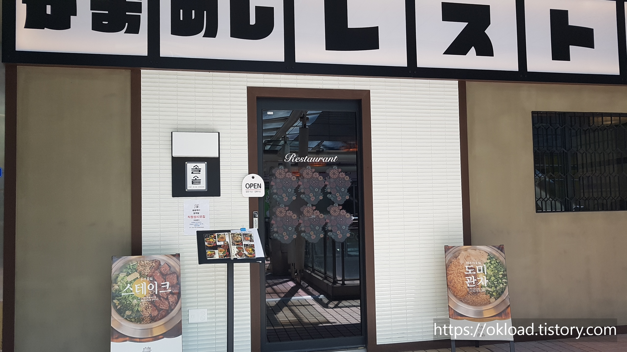 연일 계속되는 쾌청한 날씨를 만끽하고자 일산으로 가족여행을 다녀왔다. 자연을 테마로 한 당일치기 힐링여행이었는데, 광고가 난립하는 포털을 검색하기보다는 일산 토박이 현지인인 지인에게 전화하여 일산 맛집을 물어보았다. 우리 가족의 일산여행 동선을 고려하여 맛집 2곳을 추천받았었다. 최종 결정권자인 아내에게 맛집 후보지를 보여줬더니 단번에 솔솥을 택하셨다. 시그니쳐 메뉴인 스테이크솥밥을 필두로 도미관자솥밥, 장어솥밥 등 솥밥 세트를 전문으로 판매하는 음심점이었다.