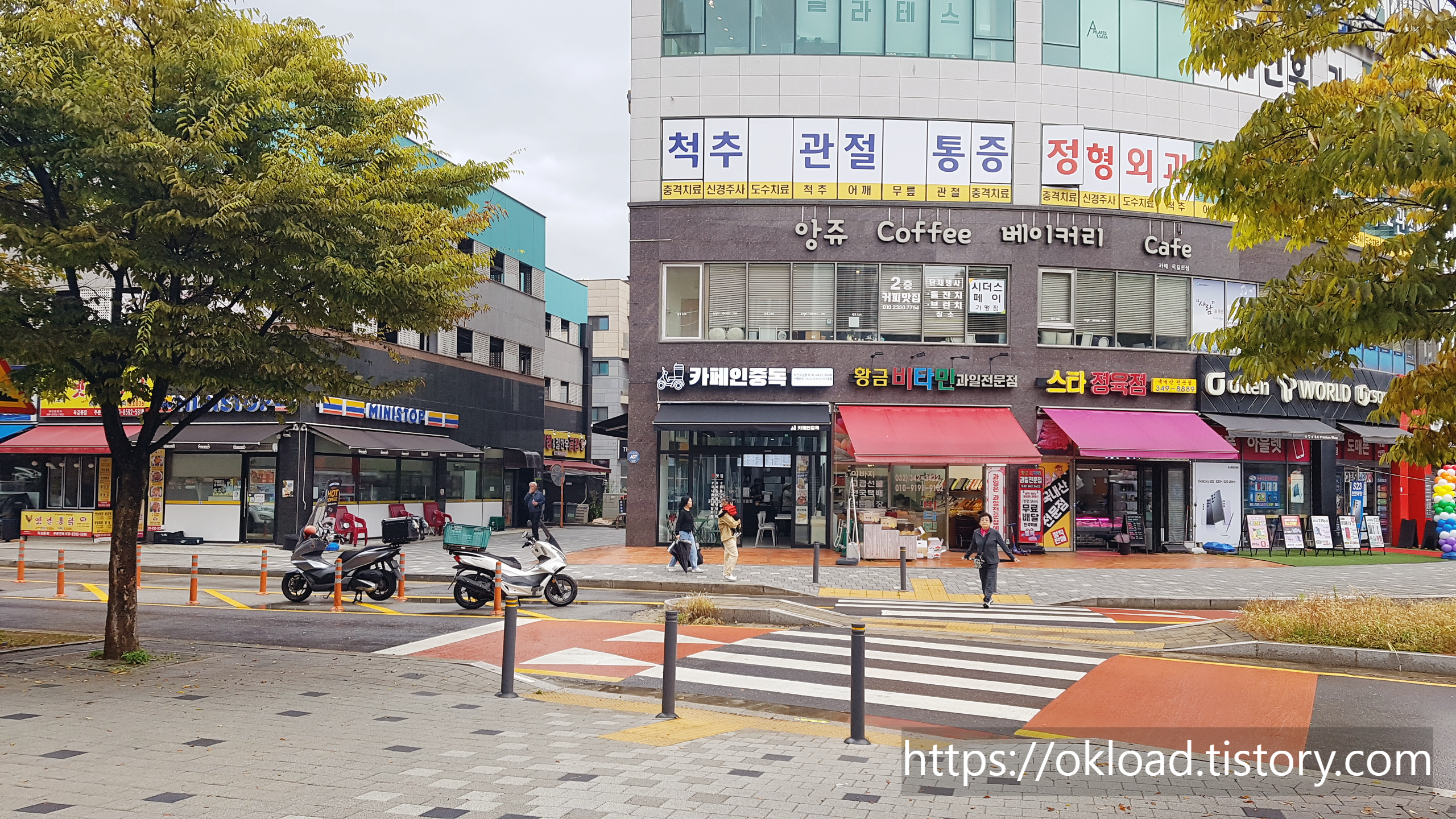 옥길동에서도 유동인구와 소비가 활발한 지역이라서 몫이 좋다고 보인다. 더욱이 카페인중독카페 바로 앞이 횡단보도이니 최상의 카페 입지로 보인다.