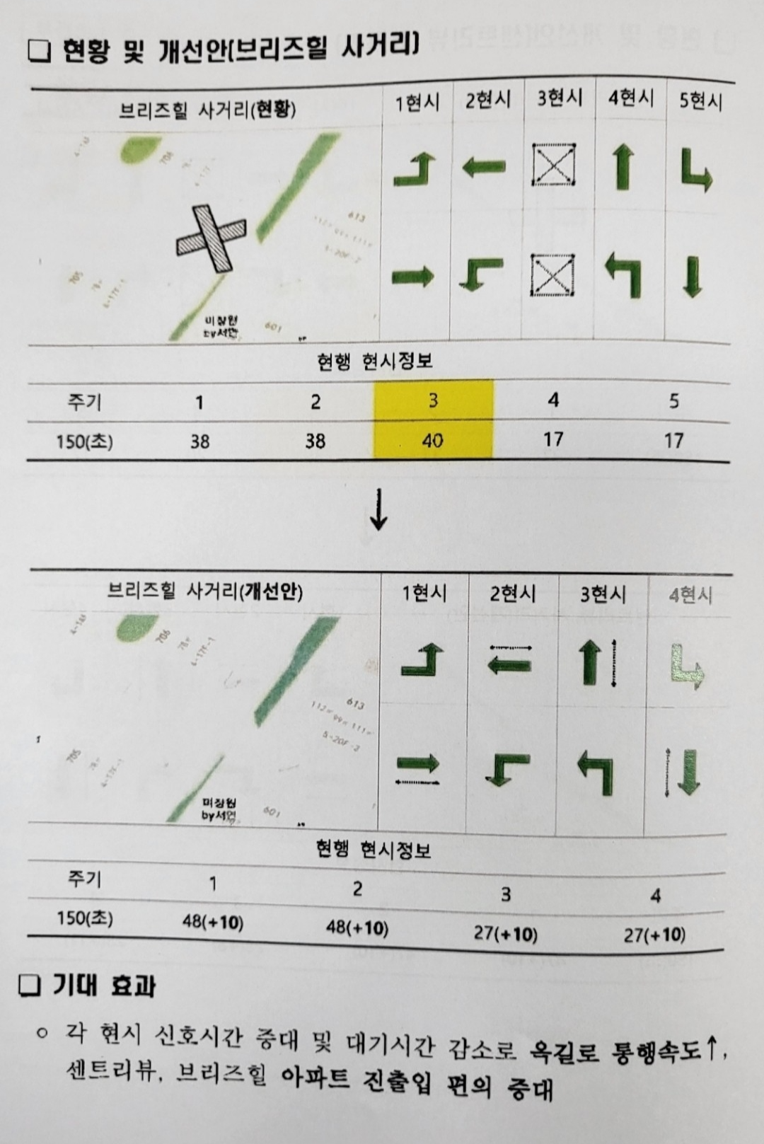 교통체계 개선안이라는 제목의 자료를 브리즈힐과 센트리뷰 아파트입주민대표회의에서 제시하면서 오로지 대각선 횡단보도 삭제의 타당성만 강조하였다.