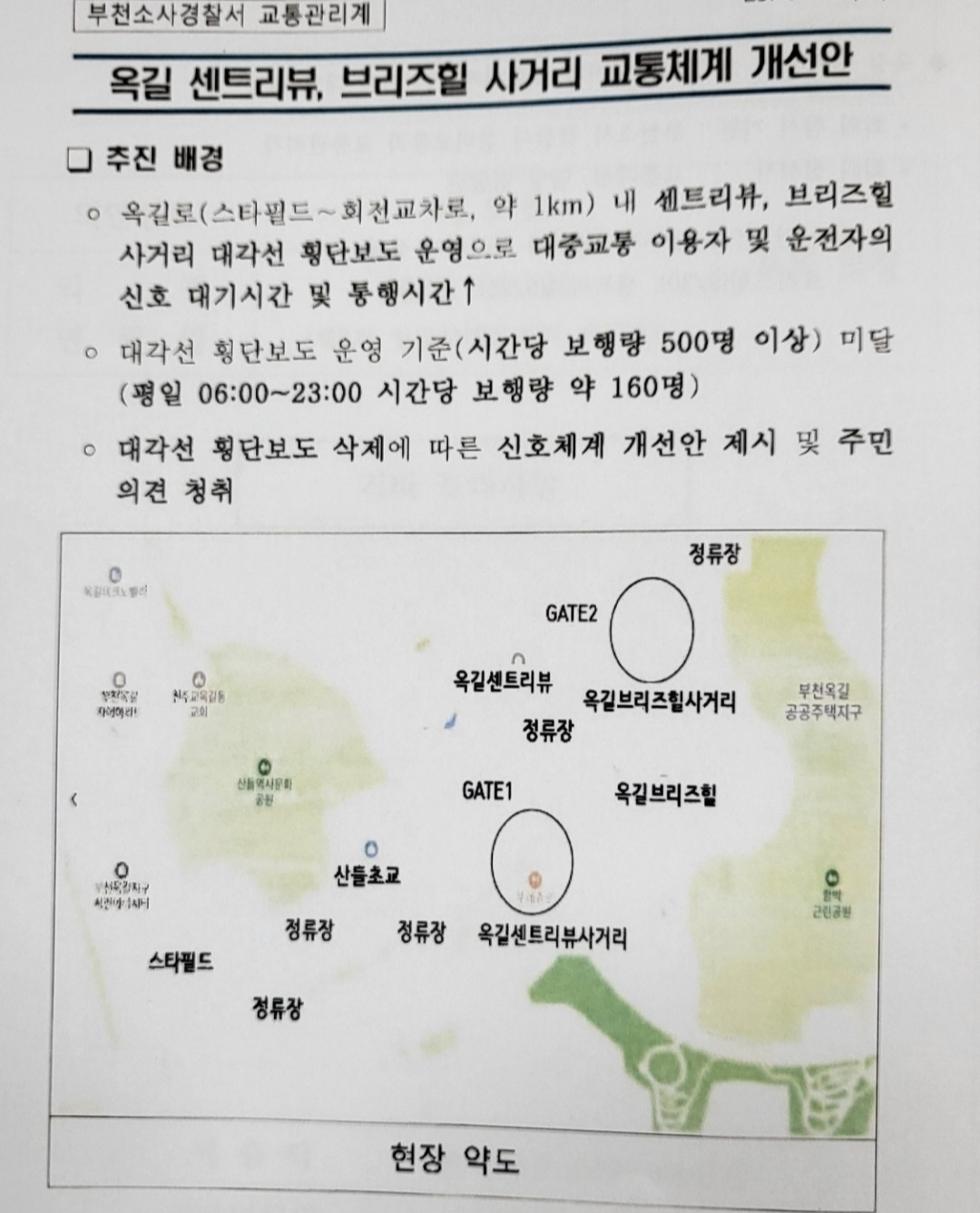 부천소사경찰서에서 옥길센트리뷰와 옥길브리즈힐 사거리 2곳의 대각선 횡단보도를 삭제하려고 한다.
