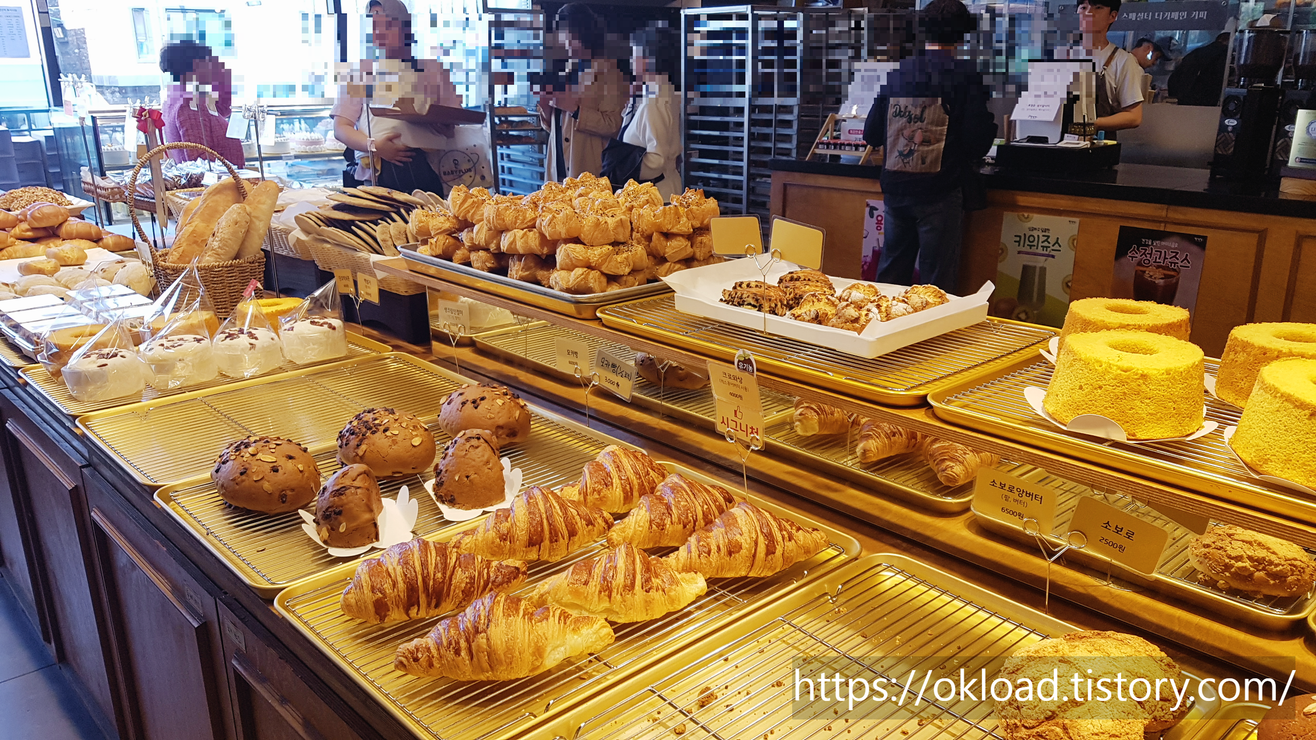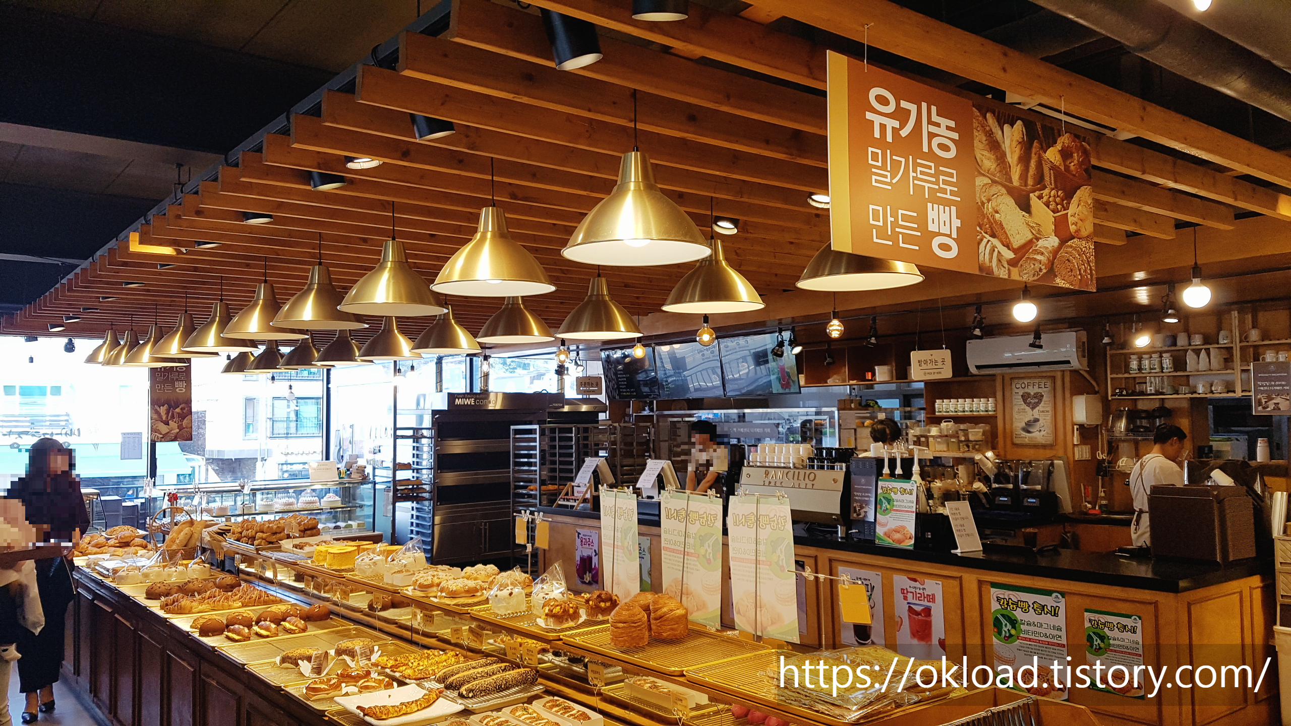 브런치와 커피를 마시기 위해서 이른 점심시간에 방문하였는데, 1층 카운터와 빵진열대에는 손님들이 제법 있었다. 벌써 모두 소진된 빵들도 보였을 정도로 빵명장 빵을 먹어보기도 전에 맛있을 것으로 기대되었다.
