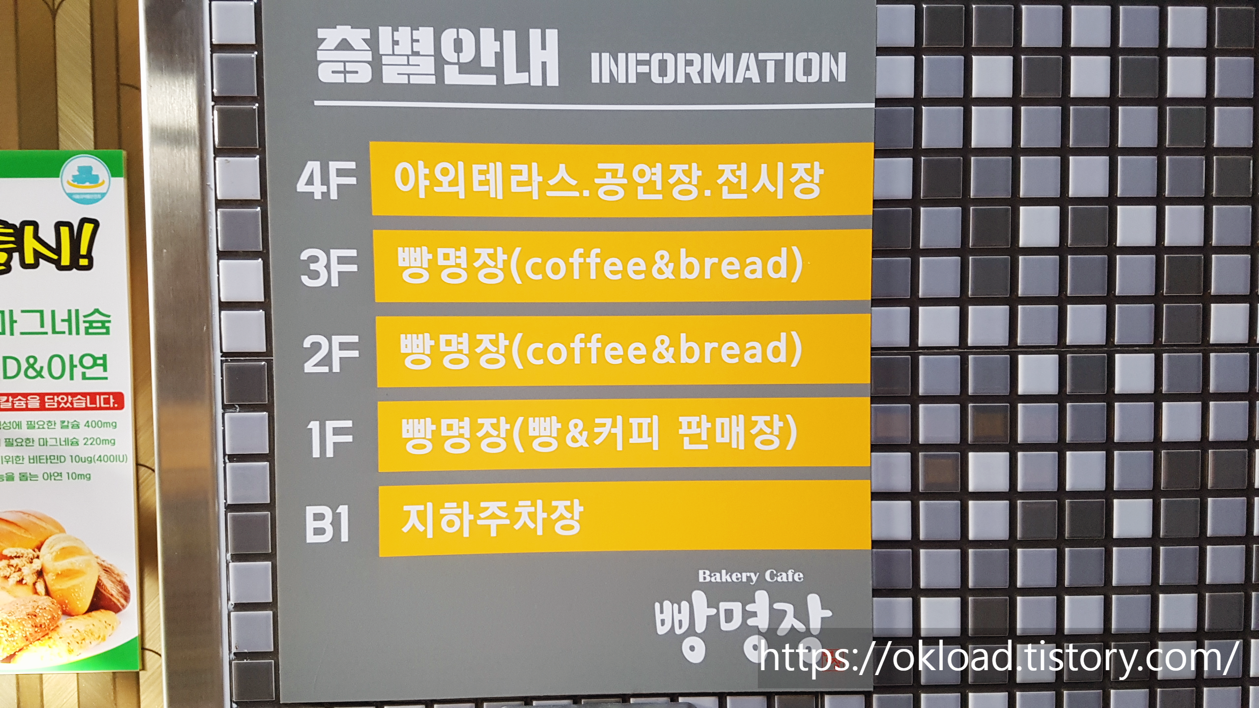 전용 지하주차장을 포함하여 총 4층까지 건물을 통째로 사용하고 있는 빵명장 카페이다. 지하1층 주차장, 1층 빵과 음료 판매, 2~3층 실내 카페공간, 4층은 야외테라스, 공연장, 전시장으로 구성되어 있다.