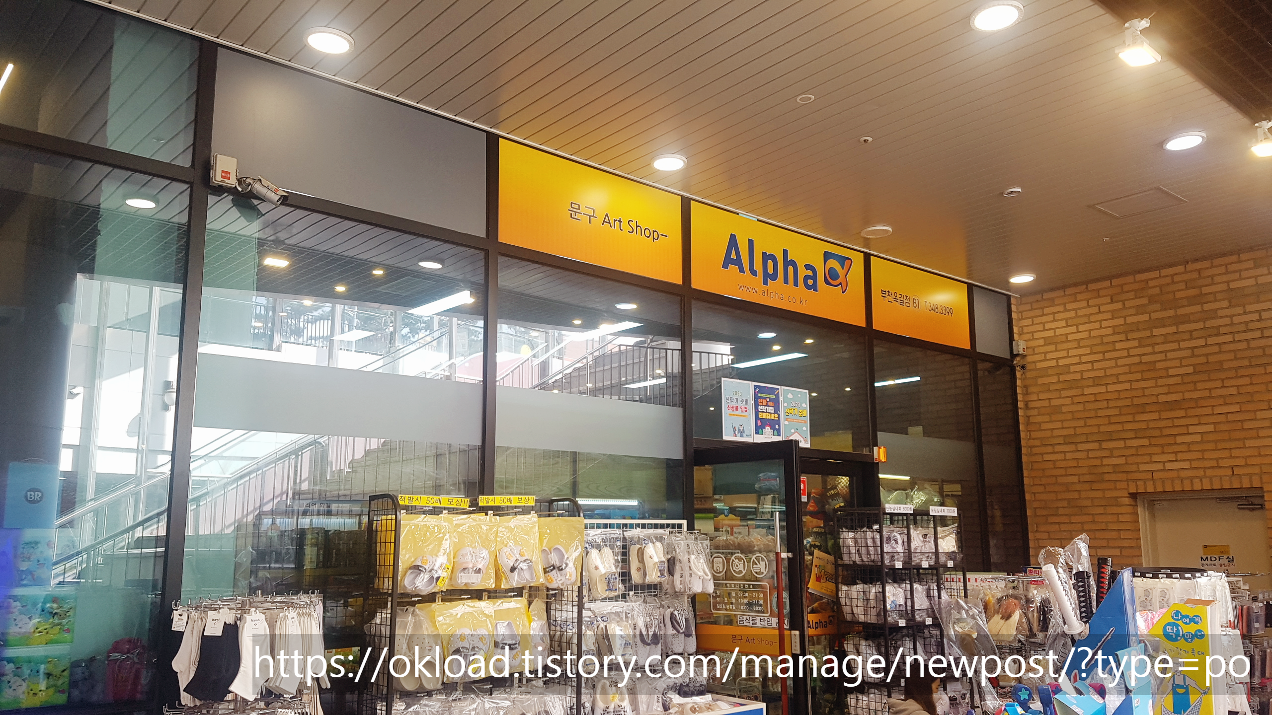 사무용품, 학용품, 장난감, 문구류 등을 판매하고, 코팅할 수 있는 알파문구다. 알파 문구 옥길점은 퀸즈파크 지하 1층에 위치한다.