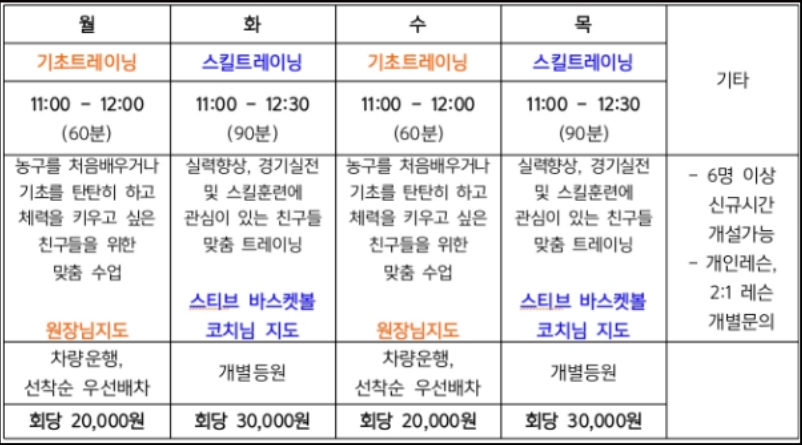 주 4회로 진행되는 농구특강은 회당 2만 원으로 수업료가 책정된다. 월요일과 수요일에 진행되는 기초트레이닝은 농구를 처음 시작하거나 기본기와 체력을 다지고 싶은 학생들에게 권한다.