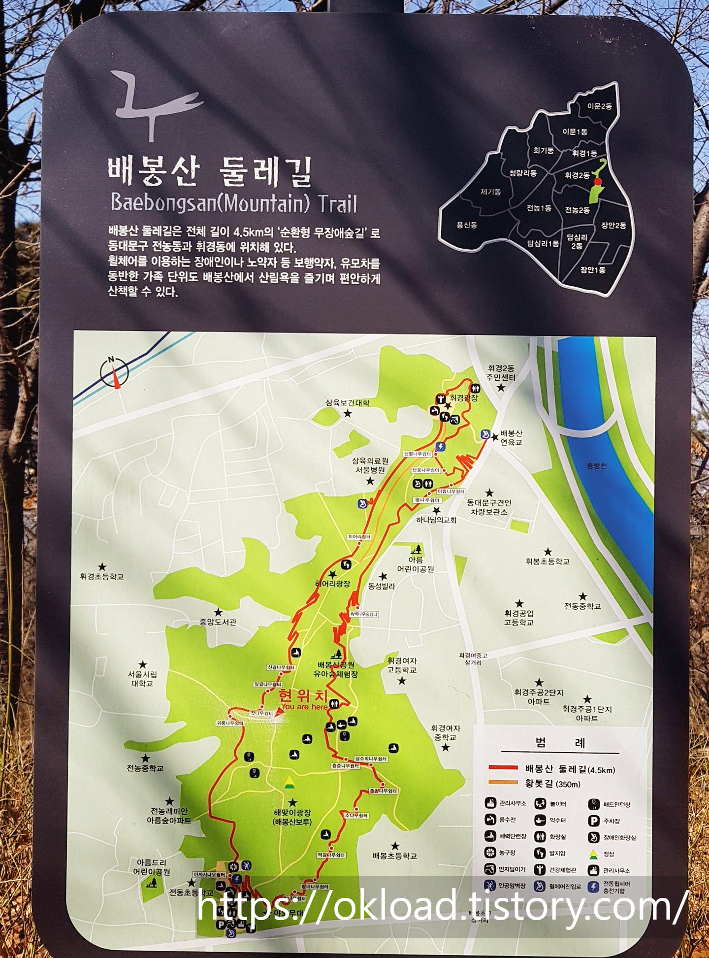 바로 서울 동대문구 전농동에 있는 배봉산인데, 오래전부터 동대문구에서도 등산로나 산책로를 잘 정비하고 관리하고 있어서 쾌적한 공원화가 되어 있는 배봉산 둘레길이다.