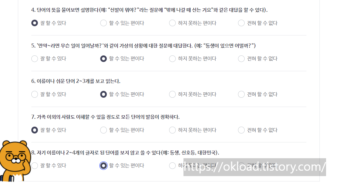 우리 아이는 이름과 몇몇 단어는 보지 않고 작성할 수는 있지만, 예로 든 신호등이나 대한민국은 말하고 쓰라하면 못쓴다. 문진표를 만든 전문가들의 지녀들은 60개월 이하 때 '대한민국'이라는 단어를 안 보고 쓸 수 있었나 보다.