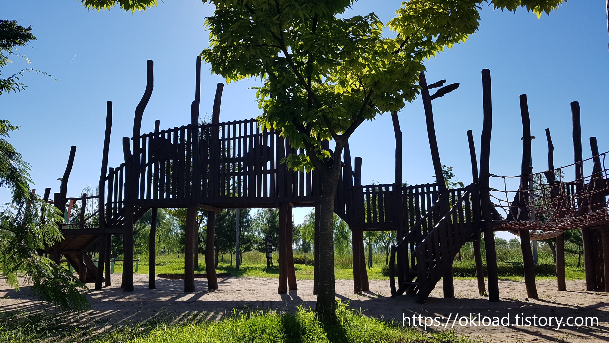 그리고, 생명공원놀이터는 바닥이 우레탄 등 인위적인 소재의 바닥이 아닌 깨끗한 모래로 덮여있다. 그래서 아이들이 놀이기구와 모래놀이를 번갈아 하면서 뛰놀 수 있다. 분명 놀이터 놀이기구로 만들어진 그늘인데, 나무 본연의 모습을 최대한 살린 통나무인 덕에 놀이터의 그늘이 마치 울창한 숲 속의 시원한 나무그늘 같다.