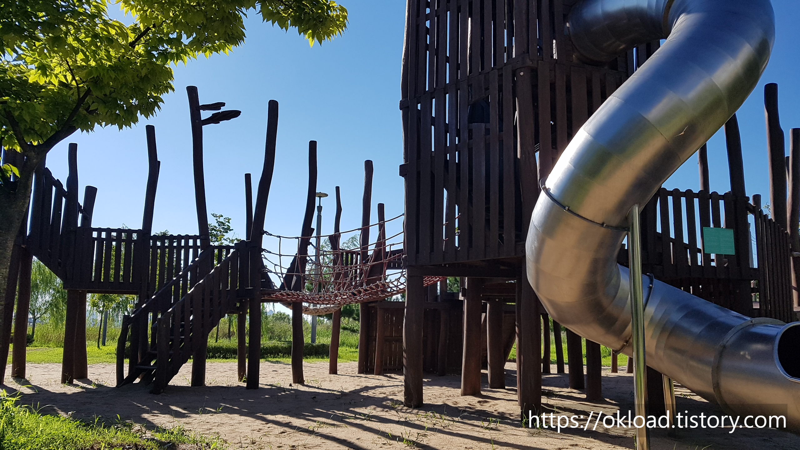 배곧SK뷰 아파트 맞은편에 위치한 생명공원 주차장에서 나오면 바로 눈에 들어오는 생명공원 대형 놀이터다. 미끄럼틀 내려오는 부분만 제외하고 대부분 친환경 원목 그대로를 보존하면서 통나무로 지어진 놀이터다. 거인이 있다면, 그 거인이 나무들을 뽑아서 만든 놀이터가 아닐까 하는 상상을 해봤다. 거인의 시선에서는 이쑤시개나 성냥으로 만들지 않았을까. 생명공원 명칭에 어울리게, 생명을 존중하고 공존하는 생명공원 놀이터다.