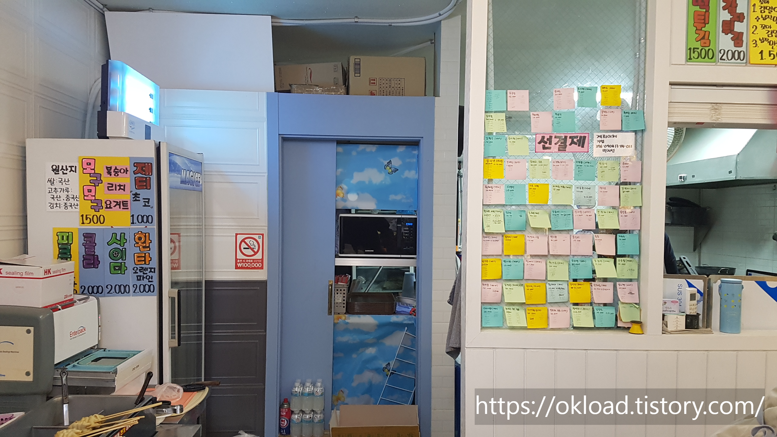 조리대 뒤 벽면에는 선결재 리스트들이 빼곡하게 포스트잇으로 부착되어 있다. 아무래도 근처에 산들초등학교와 학원가 및 상가들이 있어서 유아나 어린이들이 많이 찾는 떡볶이집이다.