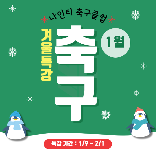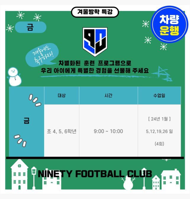 주로 오전 시간대에 특강축구교실이 시간이 편성되어 있으므로, 공교육 교육 부재 시간대에 즐겁게 축구하며 겨울방학을 알차게 보내는 시간이 되리라 본다.