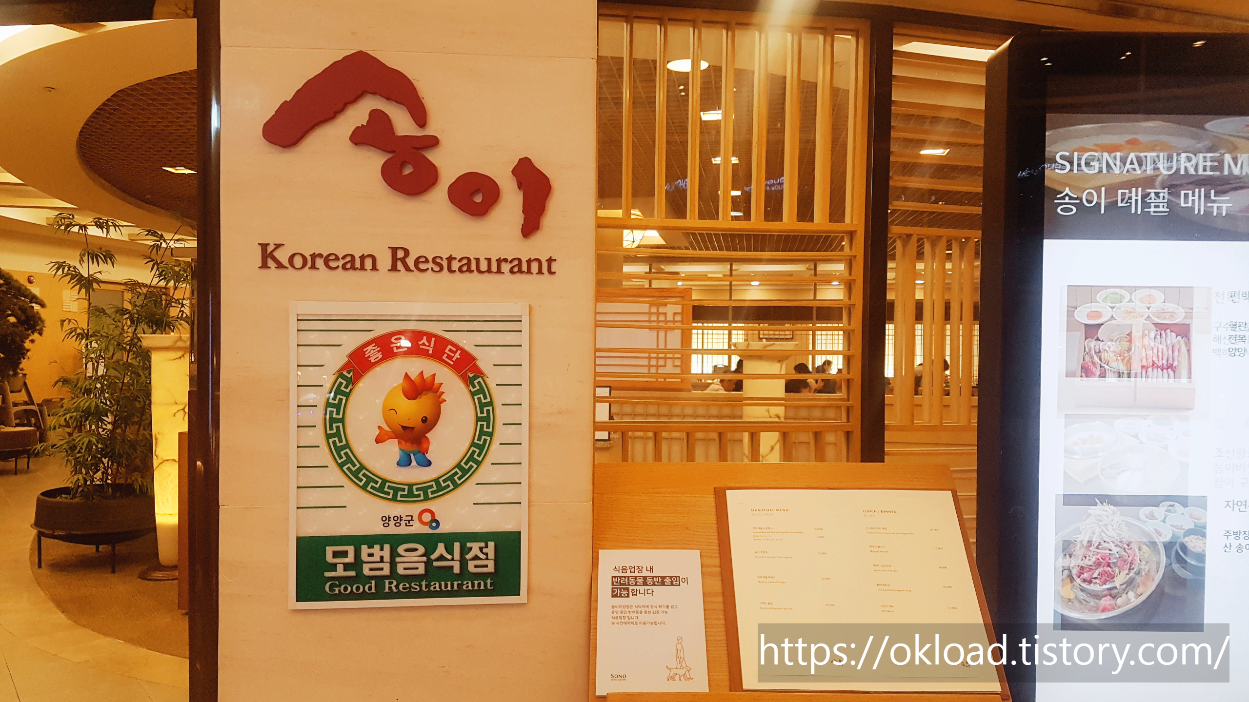 쏠비치양양 리조트 호텔 시설 내부에서 영업하는 한식집 송이는 쏠비치 이미지와 품격에 걸맞은 고급스럽고 품격이 있는 한식당의 모습이다.