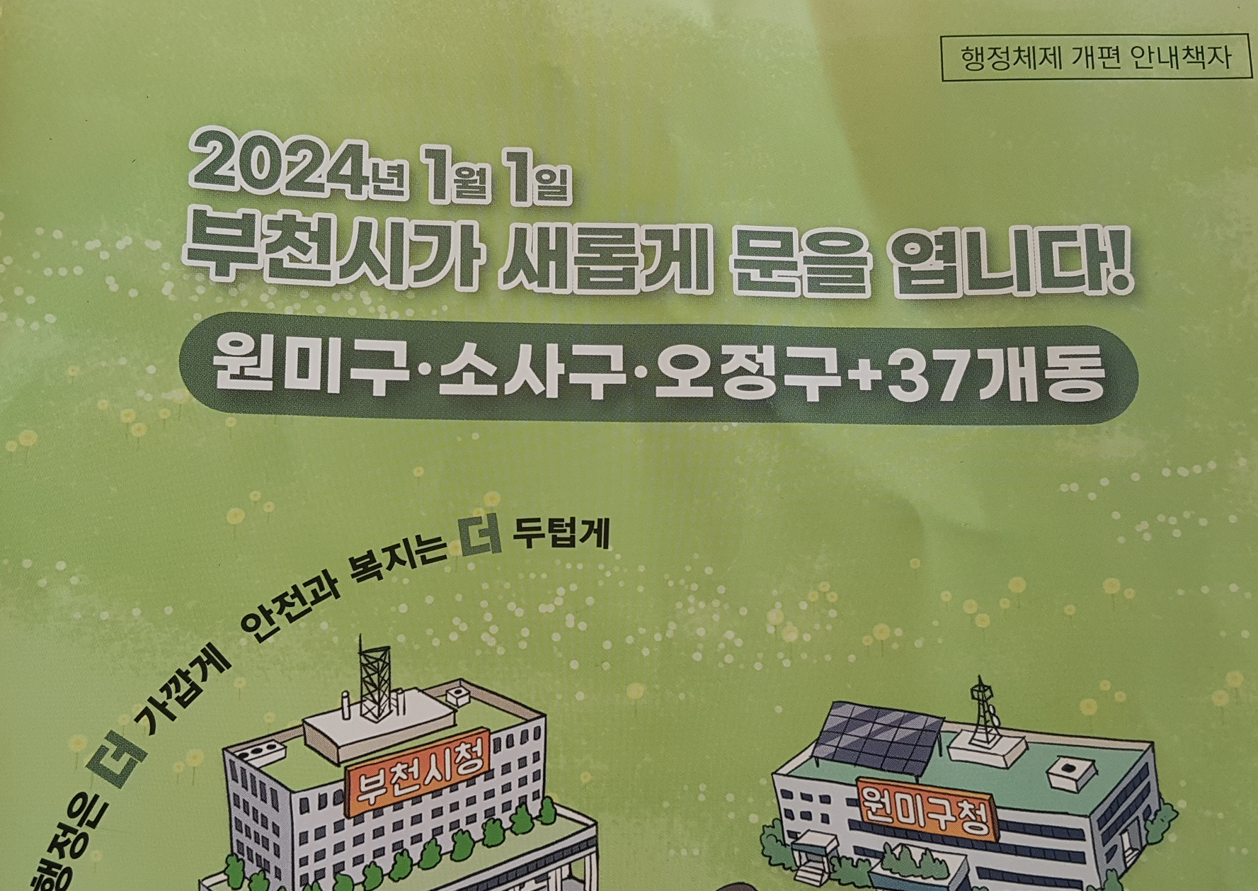 2024년 1월 1일부터 부천시 행정동 행정체제가 바뀌었다. 결론적으로 3개의 구, 37개의 동으로 개편되었다는 내용이다.