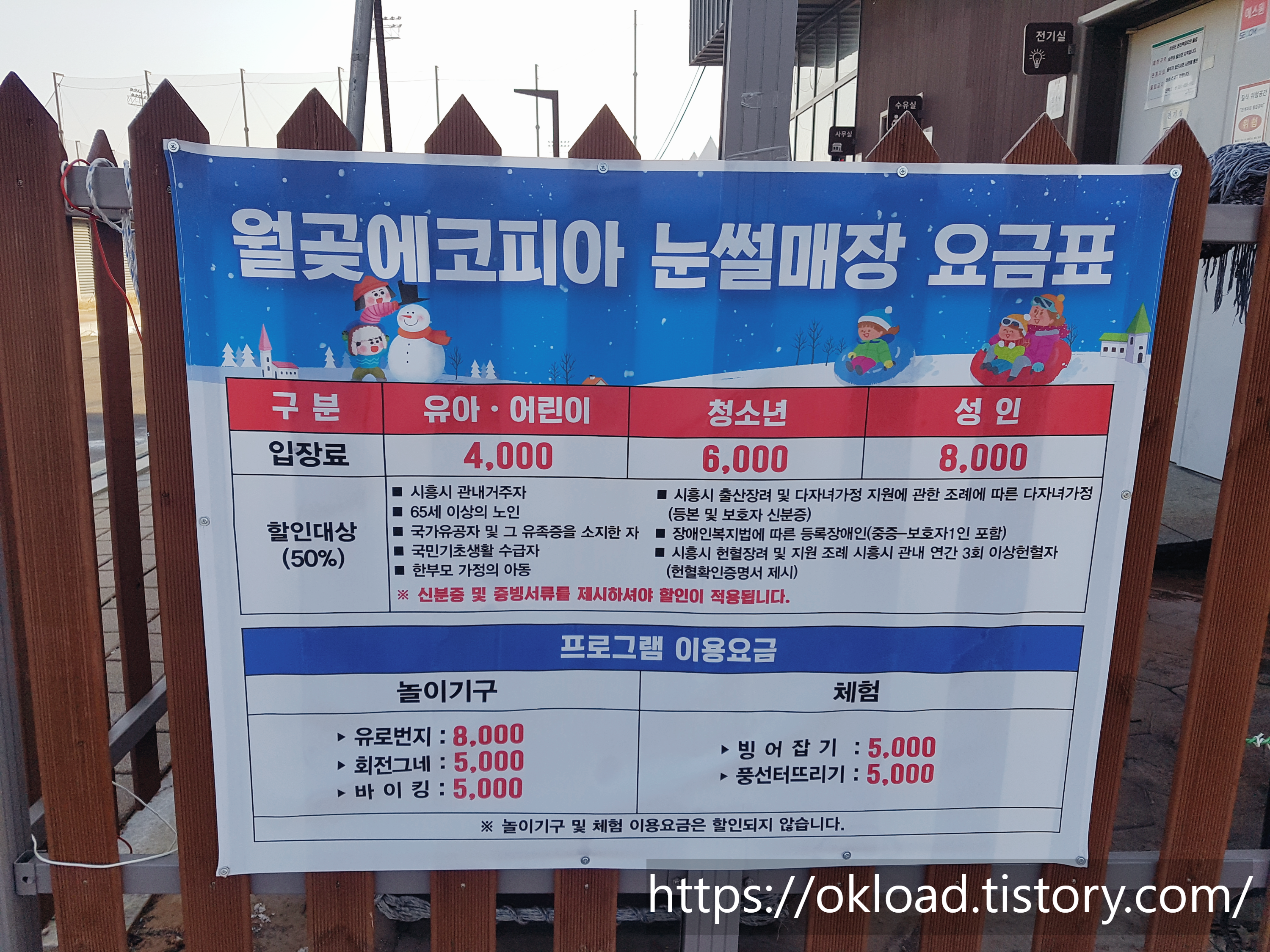 눈썰매를 타던 안타던 무관하게 입장료를 내야 하며, 따라서 부모 2명과 유아 1명이 입장 시 20,000원을 결재해야 한다.