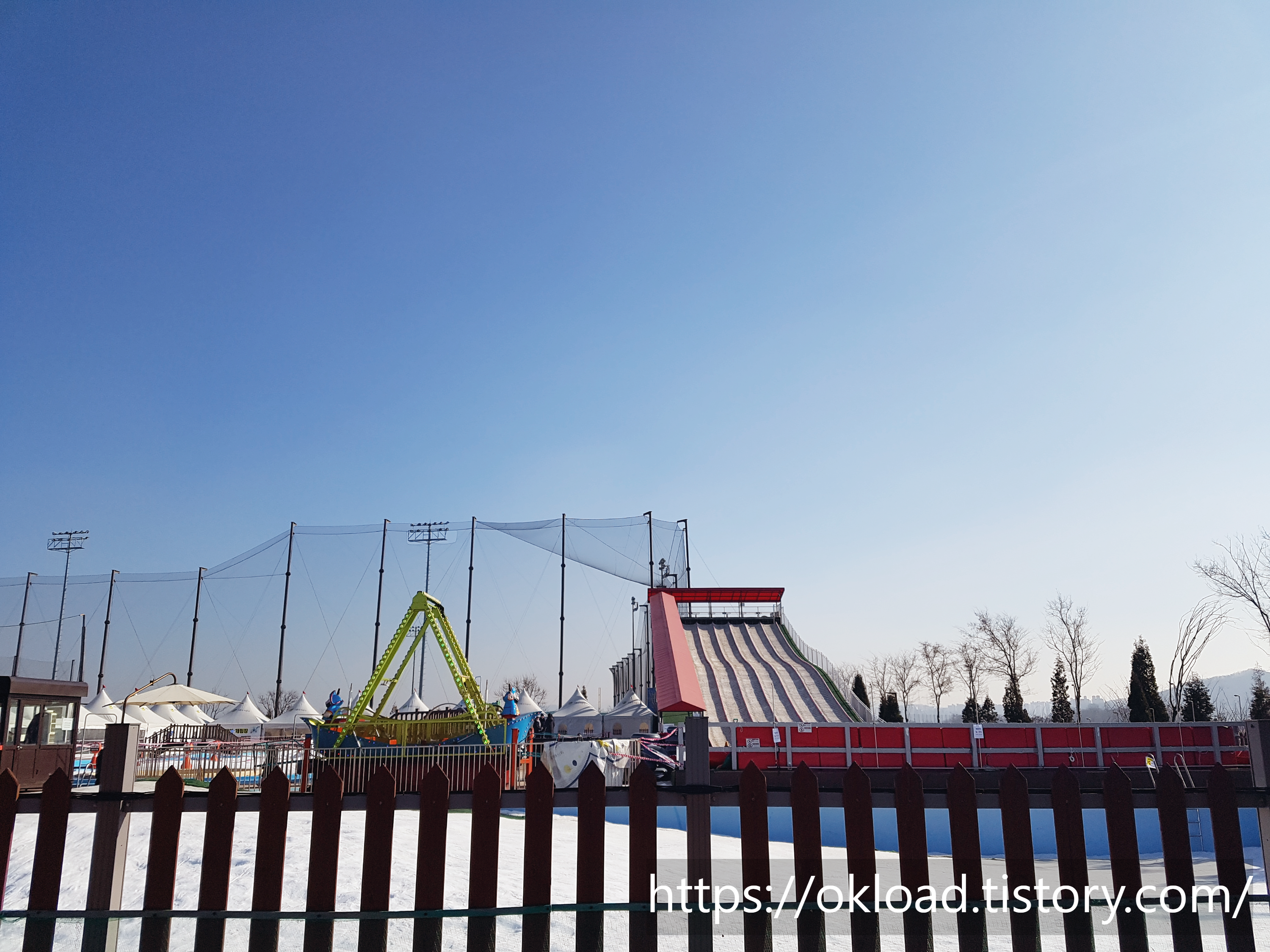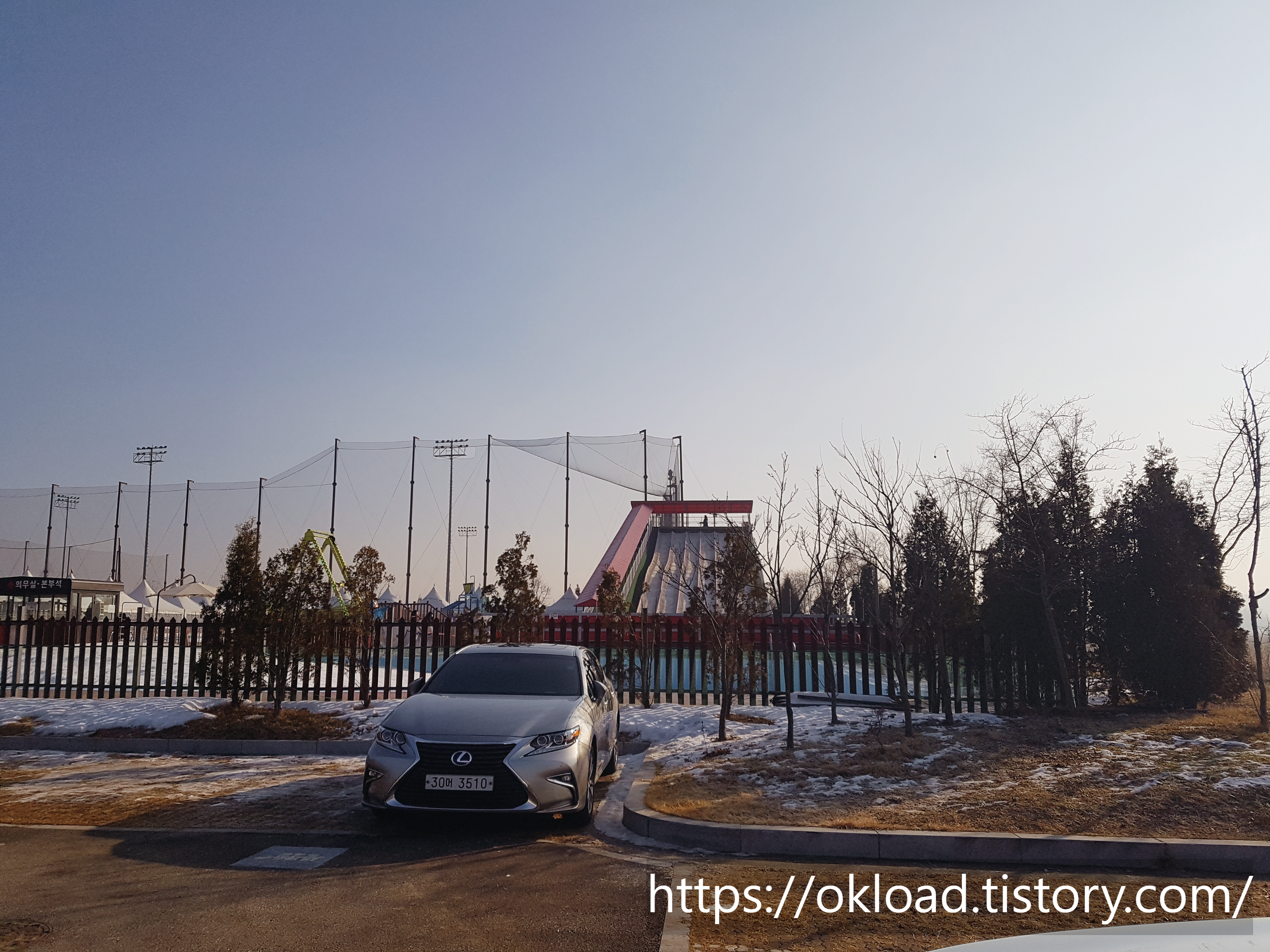 주차를 마치고 차에서 내리면, 바로 대형 상급코스 눈썰매장과 놀이기구가 보인다. 사진에는 잘 안보이지만, 아동 유아용 눈썰매장도 멀찌감치 보인다.
