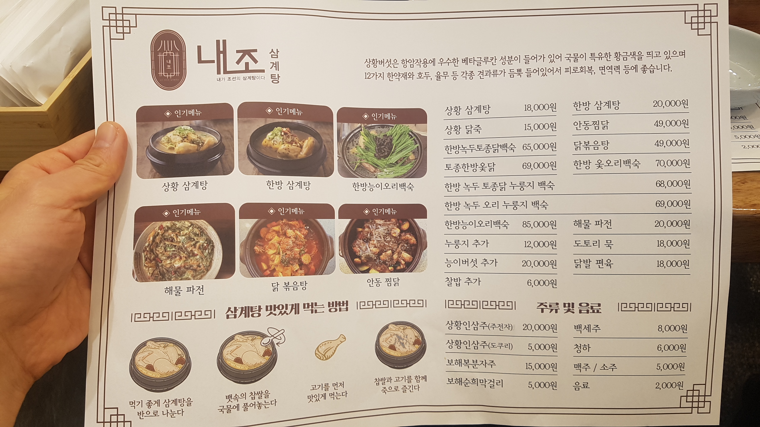 내놓으라 하는 맛집들이 몰려 있는 광명밤일마을에서 비교적 최근에 오픈한 내조삼계탕집은 현대적인 고급스럼과 쾌적한 인테리어를 자랑한다.