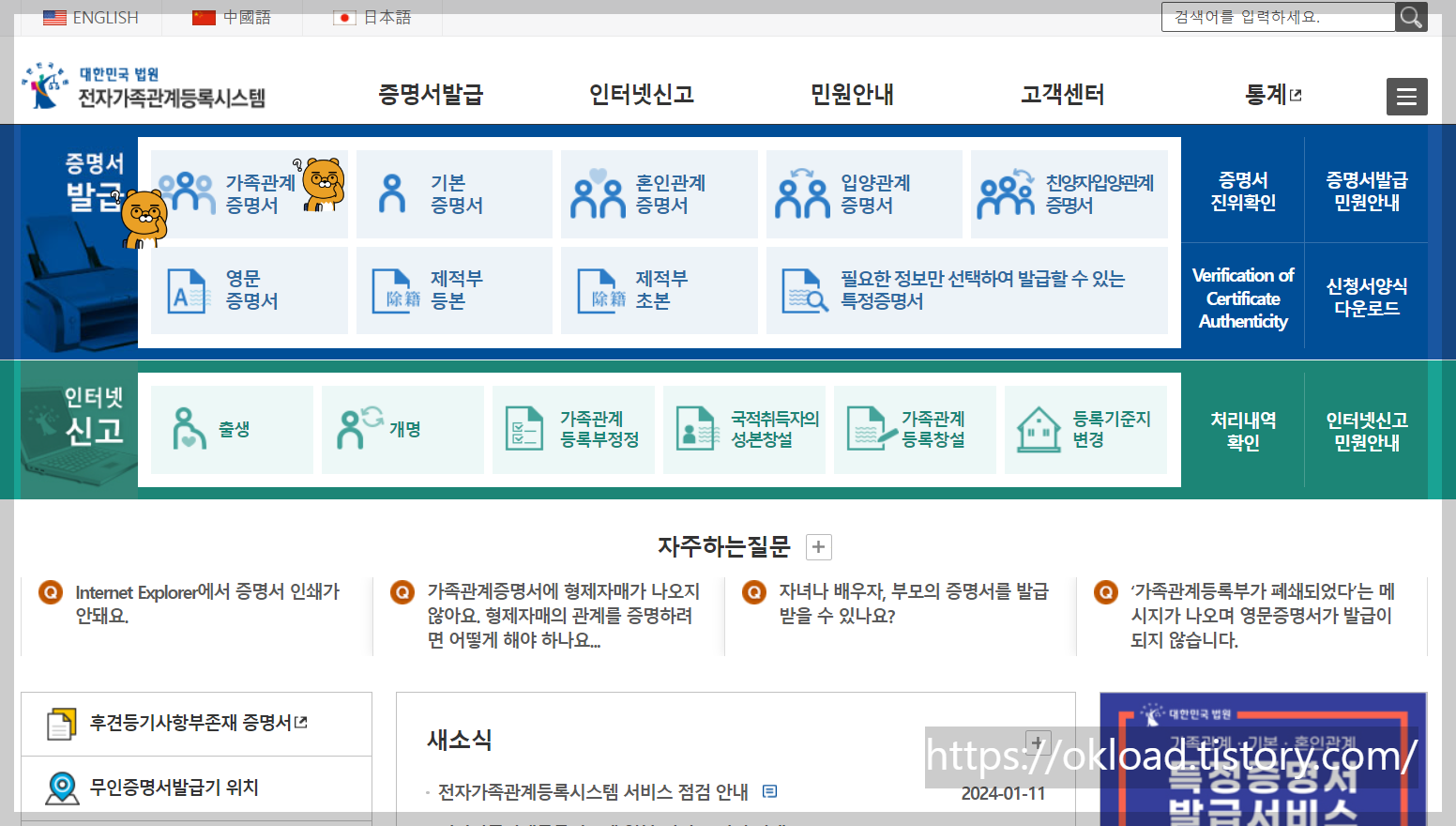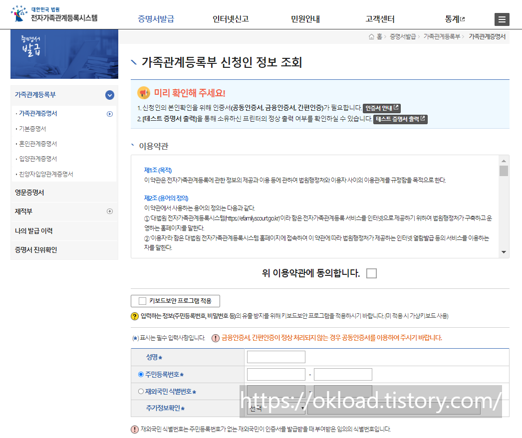 가족관계증명서는 주민센터, 동사무소, 무인발급기계 등을 통해서 오프라인으로 발급받을 수도 있지만, 집에서 편하게 인터넷 온라인발급을 받을 수도 있다.