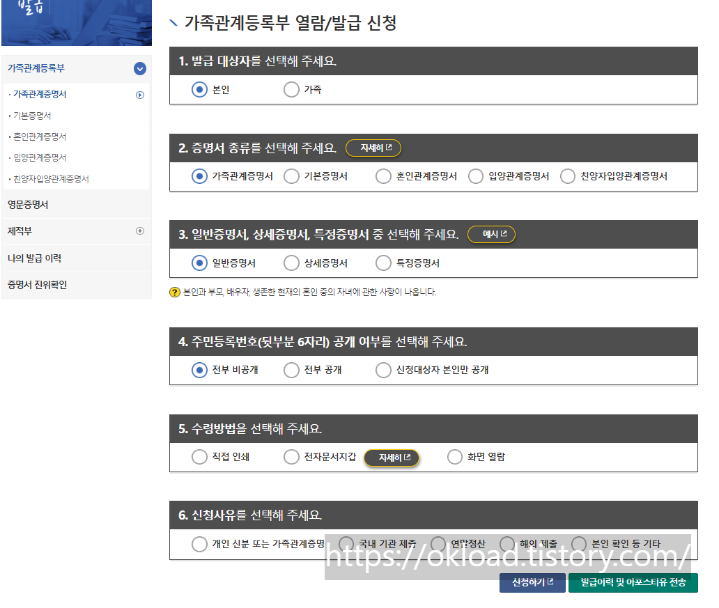 가족관계등록부 열람발급 신청 창에서는 발급 대상자, 증명서 종류, 주민번호 뒷자리 공개 여부, 수령방법, 신청사유를 목적에 맞게 클릭한다.