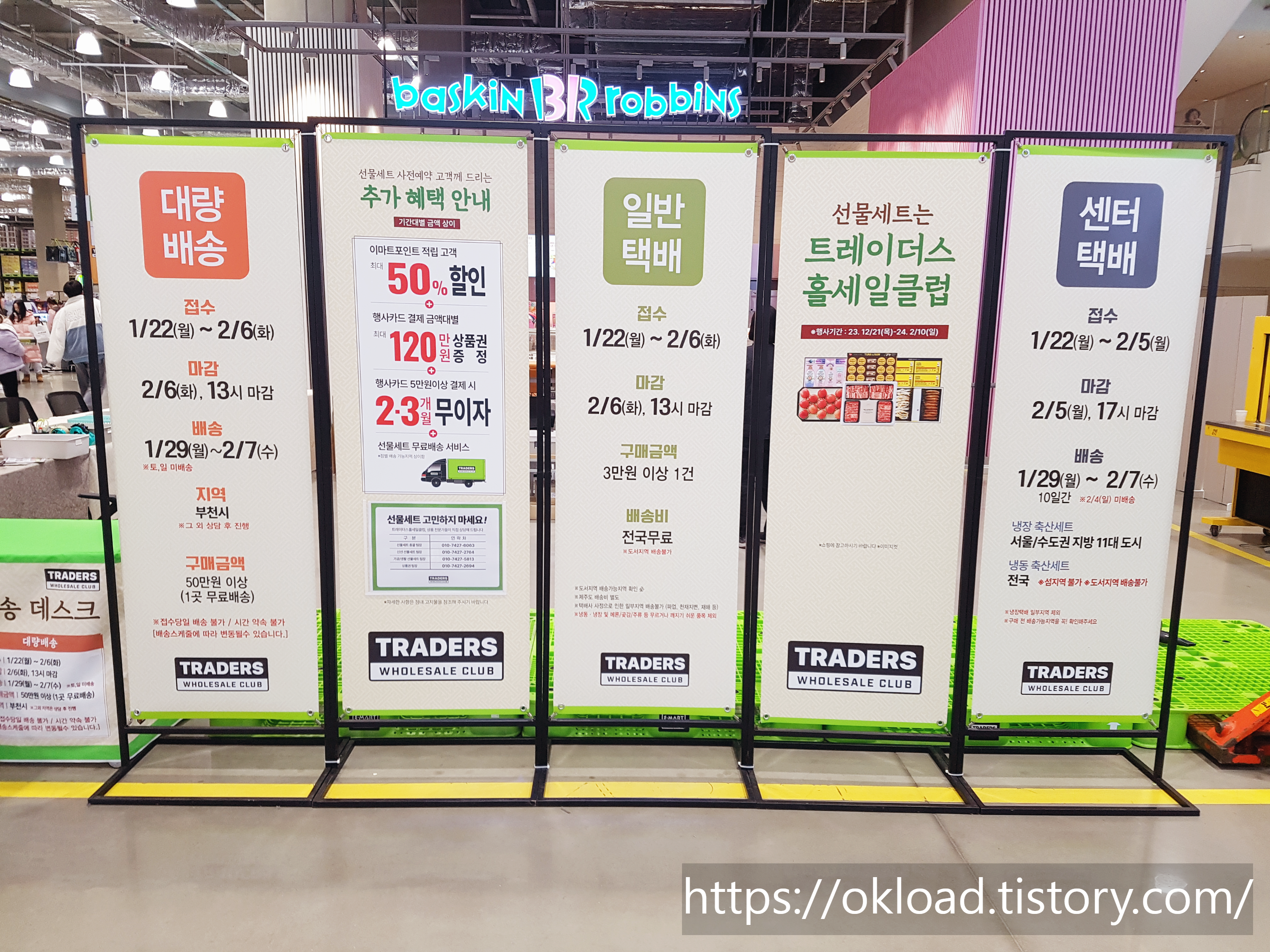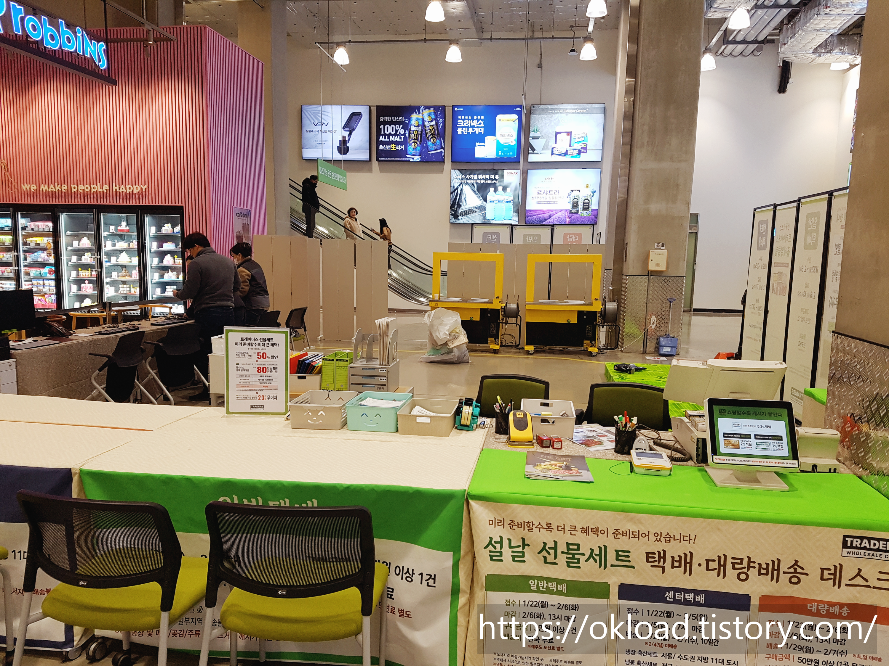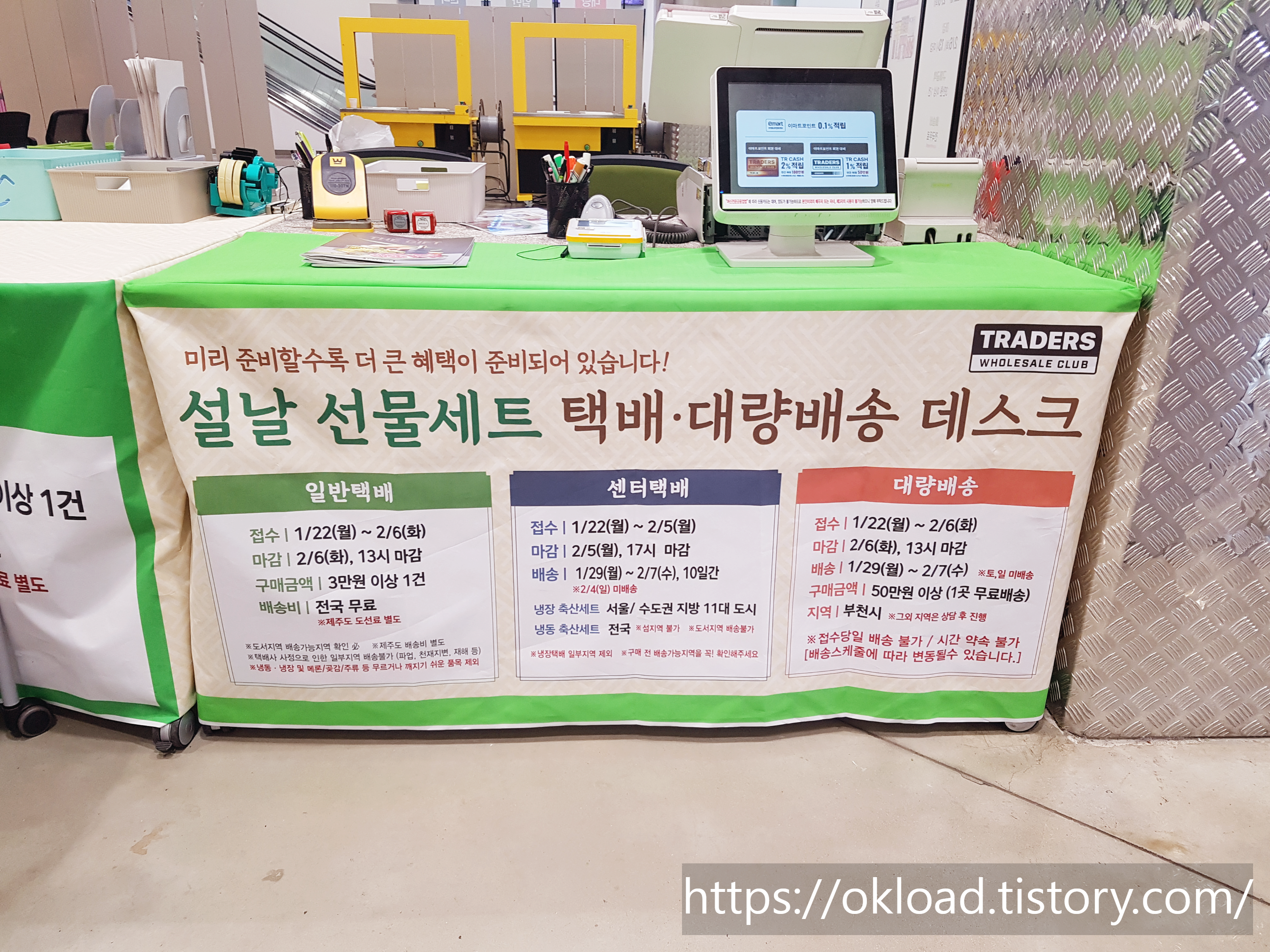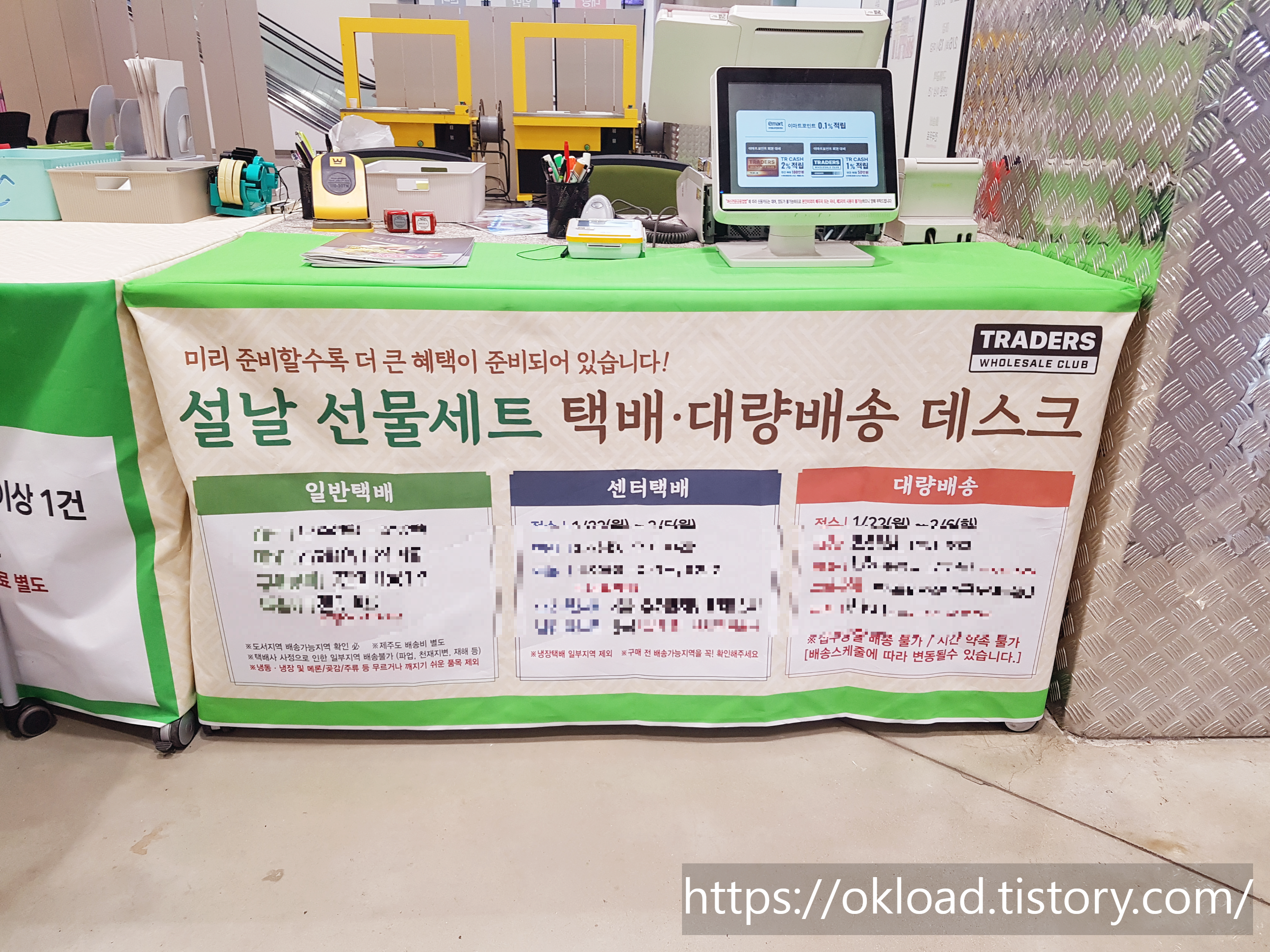2024년 대명절 설날 선물세트 택배 배송을 접수하는 데스크가 트레이더스 매장 한쪽에 마련되어 있다.