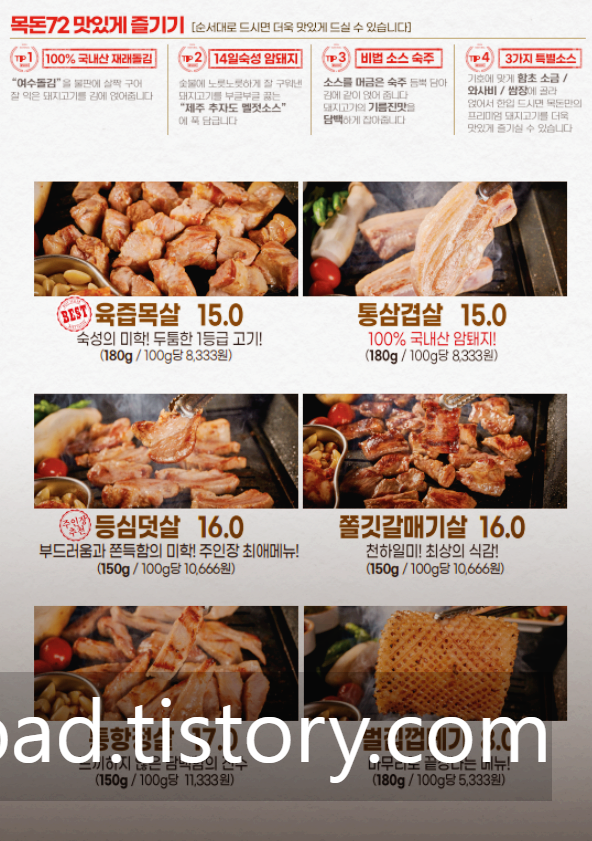 우리나라 사람이 즐겨 먹는 국민음식 삼겹살과 목살이지만, '목돈 72'의 고기맛은 정말 특별했다.