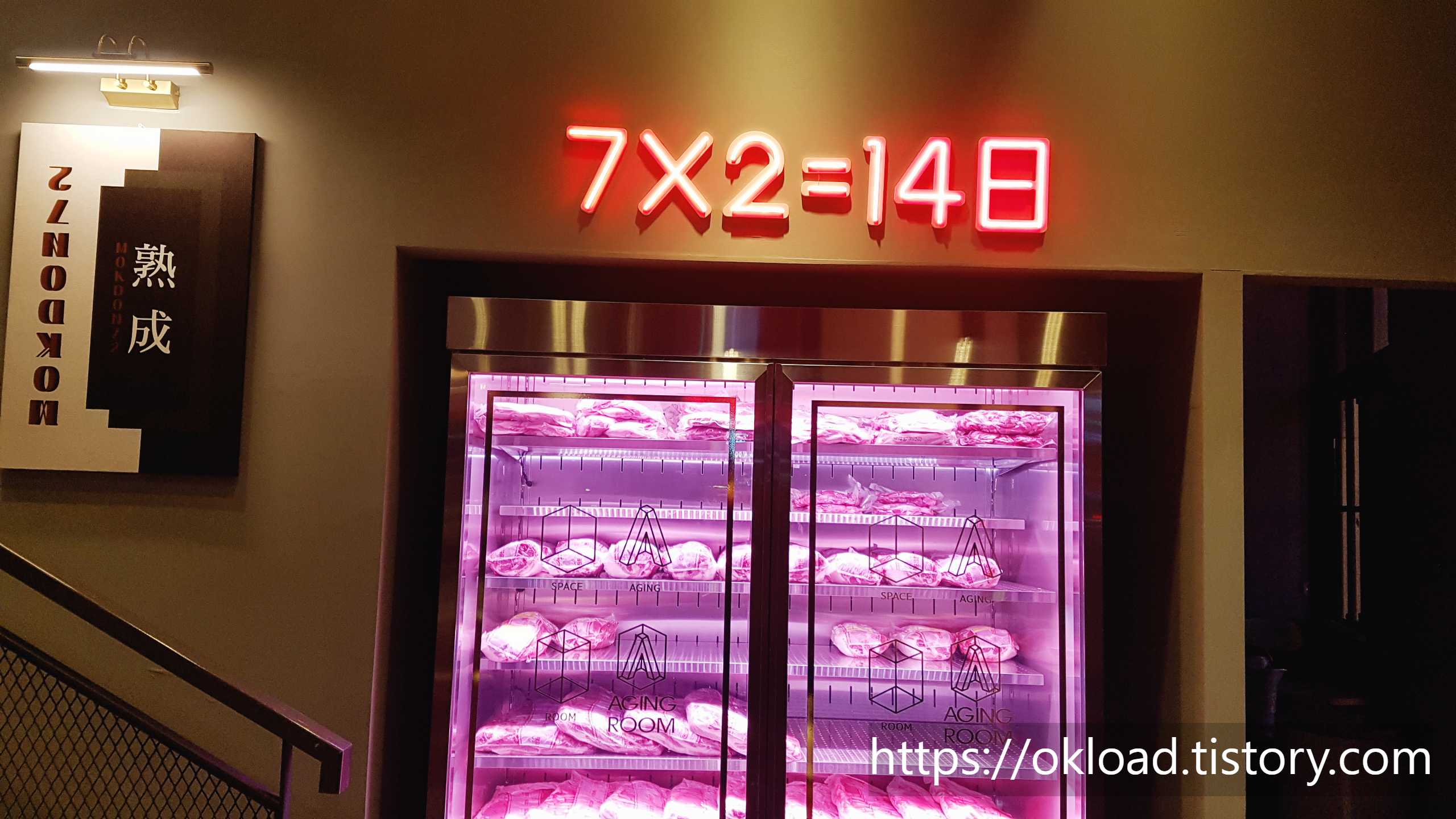 1층 가게문을 열고 들어가니 일반적인 삼겹살집과는 다른 구조와 분위기였다. 우측으로는 먹음직스럽게 보이는 돼지고기 생고기가 부위별로 오픈형 냉장고 쇼케이스에 보관되어 있었다.