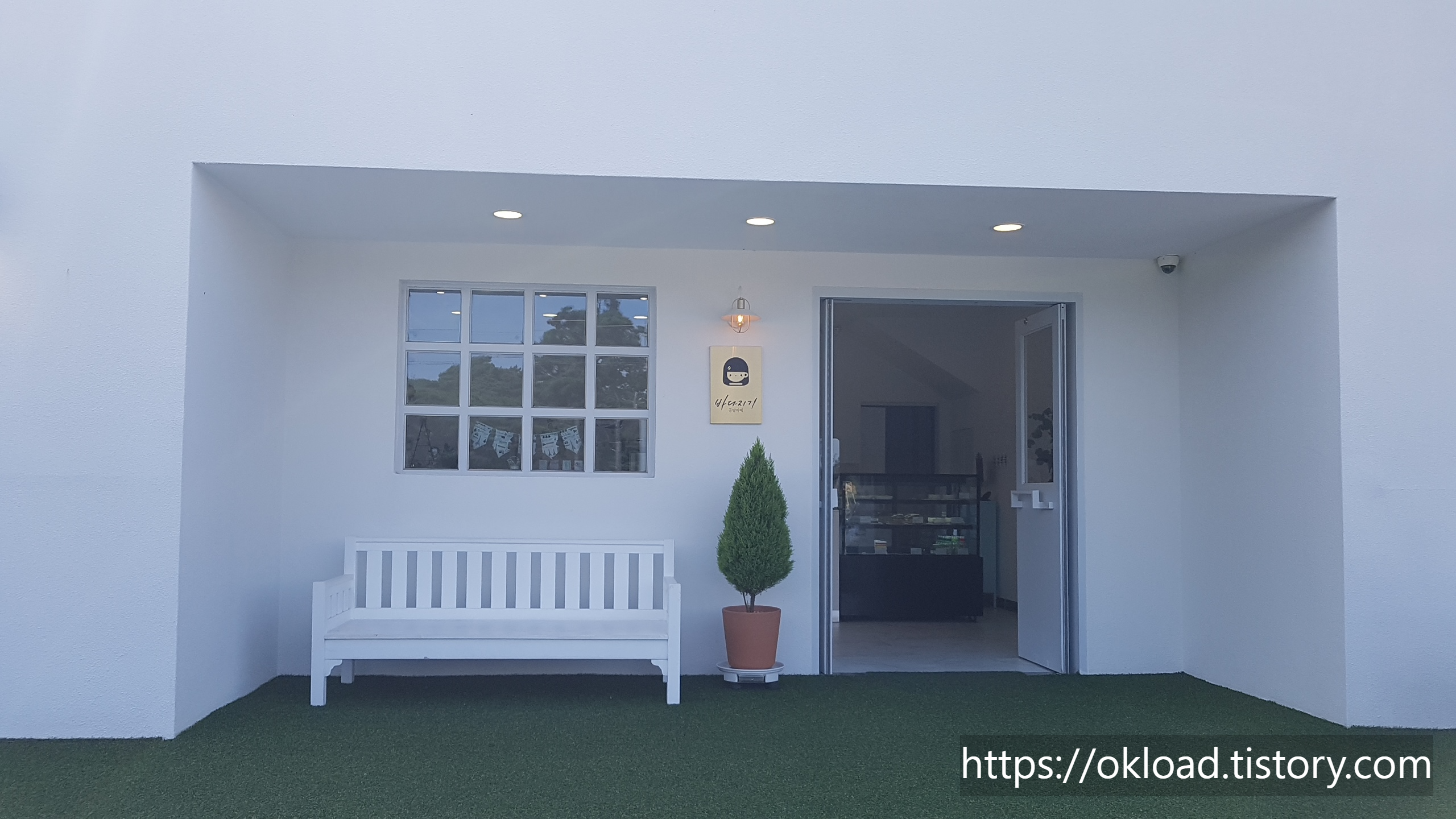 우리 가족은 카페공방을 찾을 때마다 꼭 사진을 남기는 공간이기도 하다. 흰색 건물, 초록색 바닥과 화분, 벽에 걸려있는 바다지기공방 엠뷸럼? 마스코트 액자가 깔끔하고 깨끗한 이미지를 준다.