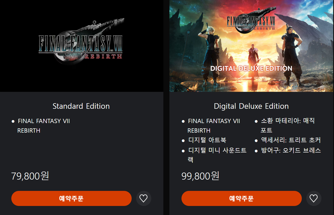 '파이널판타지7 리버스'의 판매가 가격은 기본형(스탠더드) 79,800원, 고급형(디지털디럭스 에디션)이 99,800원이다.