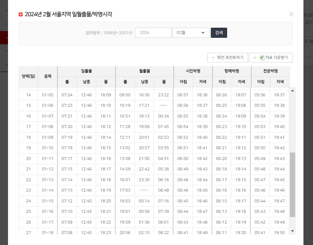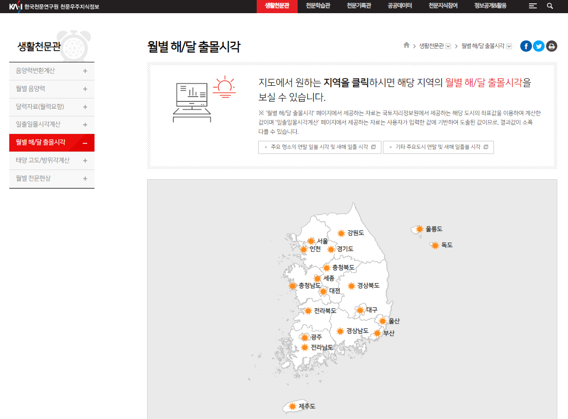 지역별로 일출과 월출(달뜨는 시간) 시간을 확인할 수 있다.